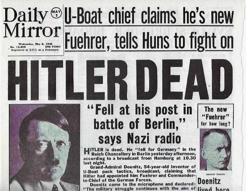 Hitler und seine Frau Eva Braun nehmen sich das Leben. Grossadmiral Karl Dönitz wird Reichspräsident und Oberbefehlshaber der Wehrmacht. Propagandaminister Josef Goebbels wird Reichskanzler (kurz danach nehmen Goebbels und seine Frau Magda Zyankali. Zusätzlich jagte sich Goebbels vermutlich eine Kugel in den Kopf. Die sechs Kinder der Familie wurden zuvor vergiftet).