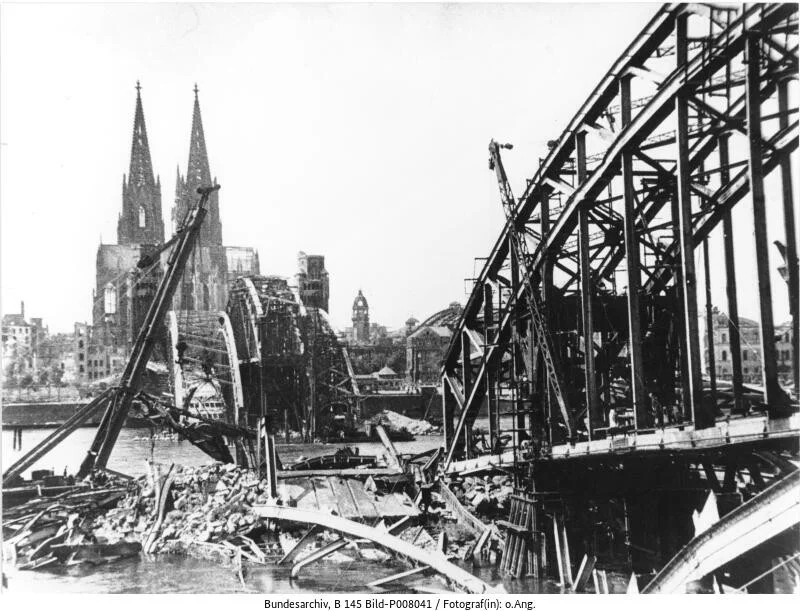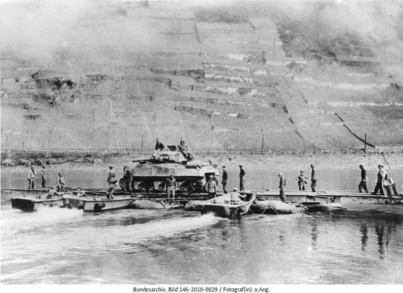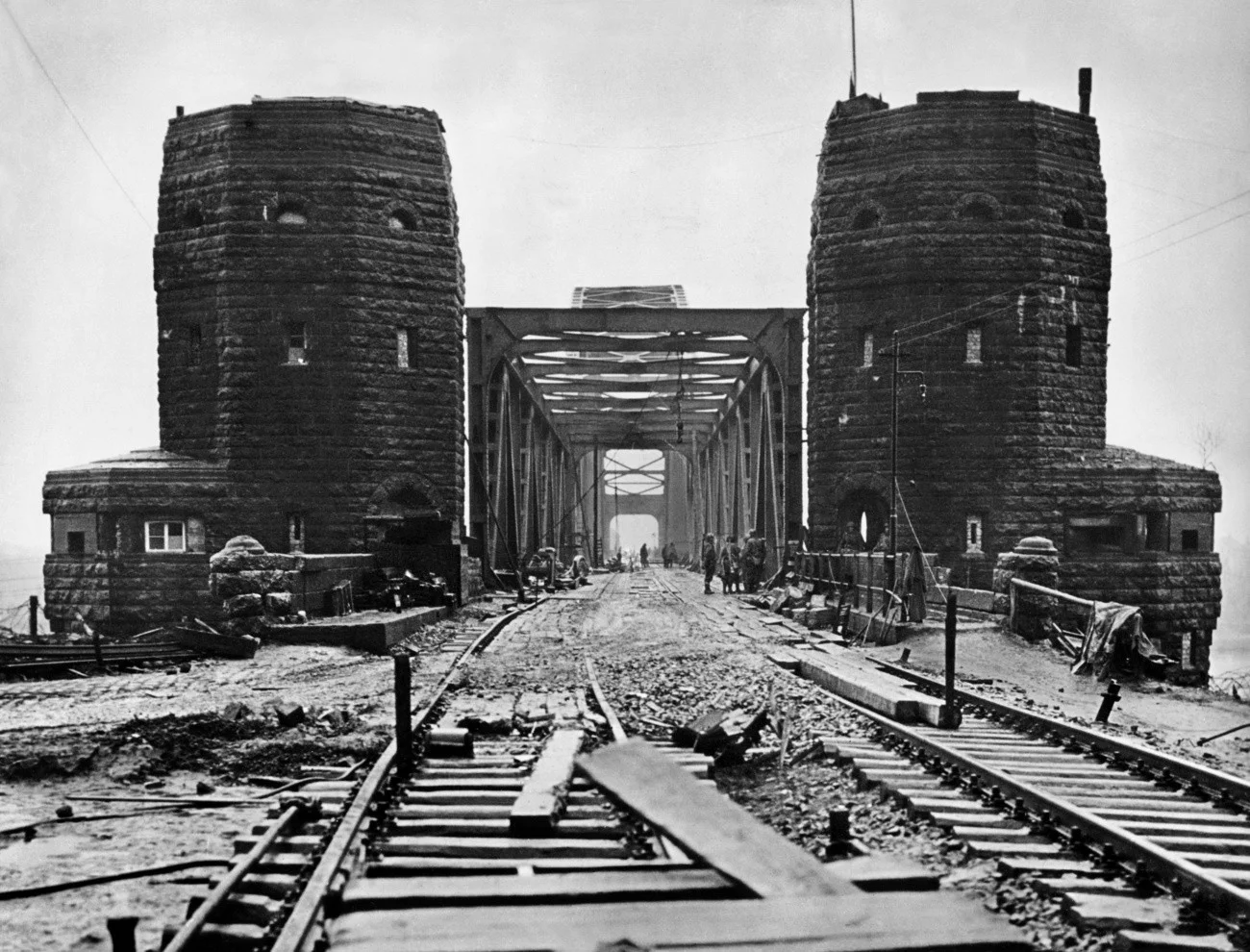 US-Soldaten erreichen südlich des Ruhrgebiets die nicht vollständig zerstörte Brücke von Remagen. Das erlaubte es ihnen, das rechtsrheinische Ufer zu erreichen und dort Fuss zu fassen.