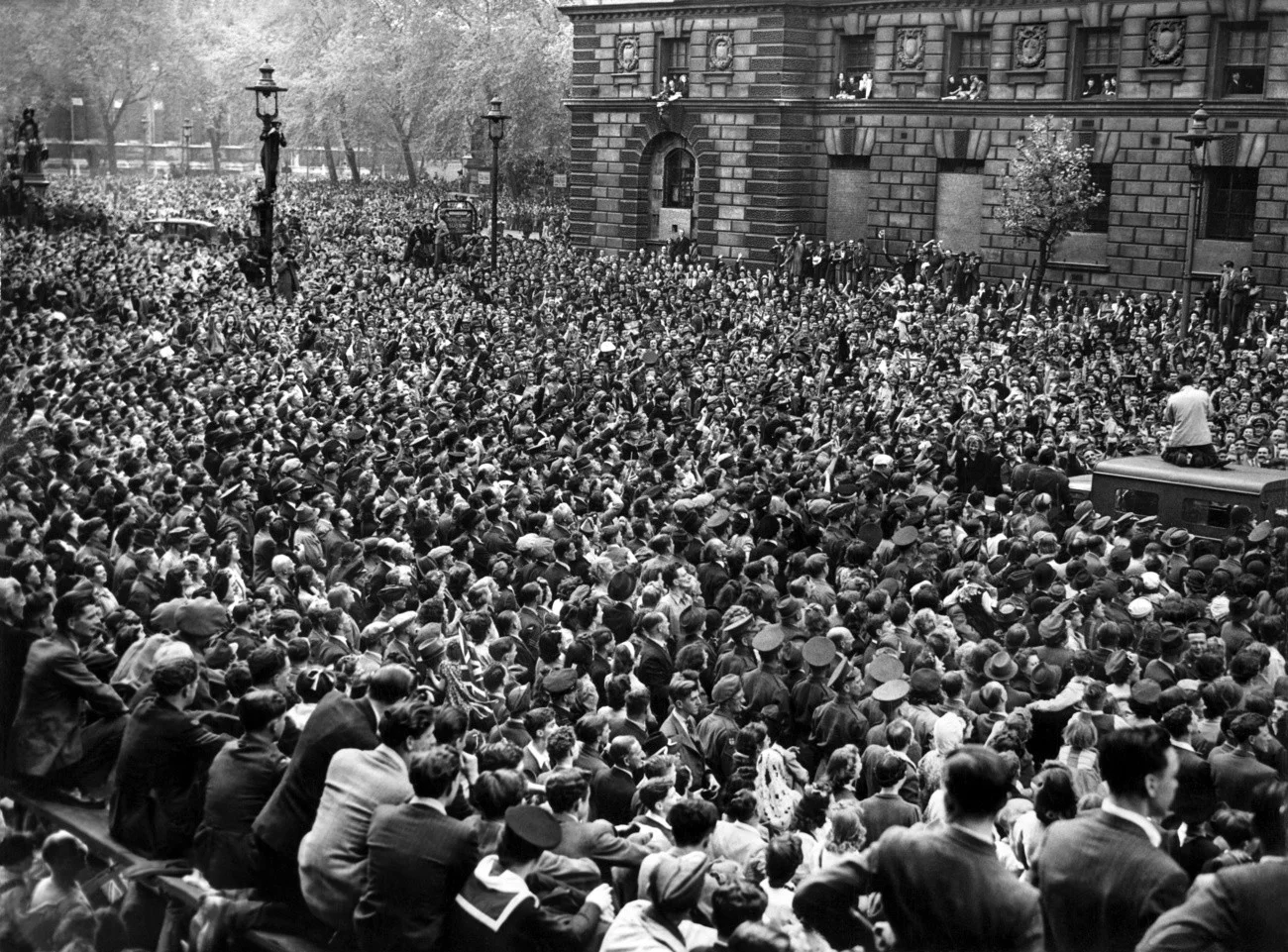 Die Bekanntgabe der deutschen Kapitulation bringt weltweit Millionen Menschen auf Strassen und Plätze.