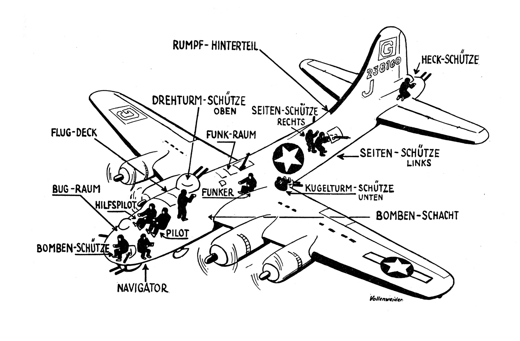Die „Fliegende Festung“ hatte eine Spannweite von 32 Metern, eine Länge von 23 Metern, eine Höhe von 5,85 Metern. Die Tragflügelfläche betrug 142 Quadratmeter. Es waren 12’731 B-17 gebaut worden. Der Stückpreis betrug ca. 250’000 US-Dollar, das entspricht heute einem Preis von ca. 3,5 Millionen US-Dollar. Die Besatzung bestand aus zehn Mann: Pilot, Co-Pilot, Bombenschütze, Navigator, Bordingenieur, Funker und vier Schützen. Das maximale Startgewicht betrug 30 Tonnen. 13 bewegliche Browning-Maschinengewehre Kaliber 12,77 mm waren zum Selbstschutz eingebaut. Total befanden sich 7’485 Patronen an Bord. Bis zu 5’800 Kilogramm Bomben konnten mitgeführt werden.