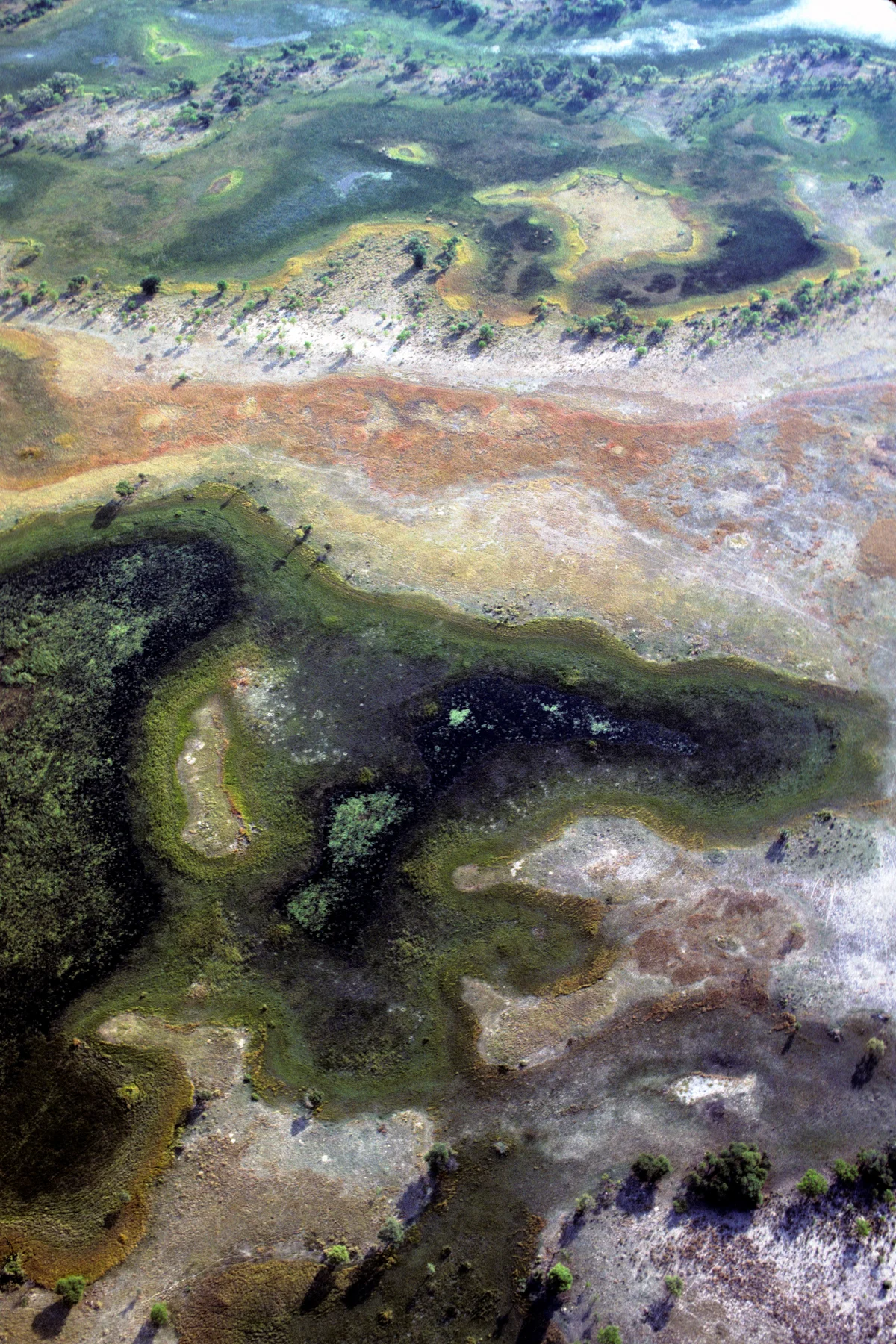Das Binnendelta, mit 16 000 Quadratkilometern angeblich das grösste der Welt, ist ein Schwemmkegel. Der Okavango, von den Regenfällen in Angolas Hochland genährt, ergiesst sich im Nordwesten Botswanas in die Kalahari, anfänglich in einem ziemlich kompakten Lauf, dem „Pfannenstiel“, dann aber in einen Fächer von Hunderten Kanälen und Rinnsalen zerfasernd. Im März wird am Eingang des Deltas der höchste Wasserstand gemessen. Von hier arbeitet sich die Flut während vier Monaten durch Pflanzendickichte 250 Kilometer südwärts vor. Ihre Ankunft am Südende auf dem Höhepunkt der Trockenzeit im Umland schafft vorübergehend in der Kalahari eine Oase. Bei einer ungewöhnlich starken Flut bildet sich eine 12 000 Quadratkilometer grosse Pfütze. In den Folgemonaten versickert und verdunstet das Wasser wieder. Im Dezember (unser Bild) bleiben im Süden nur sumpfige Kuhlen und trocken gefallene Steppenflächen zwischen baumbestandenen Inseln übrig. Obwohl das Delta bei geringem Gefälle fast topfeben und sein Boden überall gleichartig, sandig, ist, bilden sich abhängig von der Häufigkeit und Dauer der Überflutung nahe beieinander ganz verschiedene Lebensräume heraus: von den perennierenden Gewässern und permanenten Schilf- und Papyrus-Sümpfen im Norden bis zu dem nur jahreszeitlich überschwemmten Gras- und Waldland im Süden. Eine besondere Rolle kommt den meist mit Palmen bestandenen Inseln und Inselchen zu; es gibt ihrer Zehntausende, manche nur wenige Quadratmeter gross. Sie sind das Werk von Termiten. Ökologen glauben, dass die Inseln und ihre Bäume wesentlich mithelfen, die Versalzung des Deltas zu verhindern. Trotz 500 000 Tonnen gelöster Salze, die der Okavango jährlich in das System einbringt, sind im Delta Seen, Teiche und Tümpel nicht brackig.