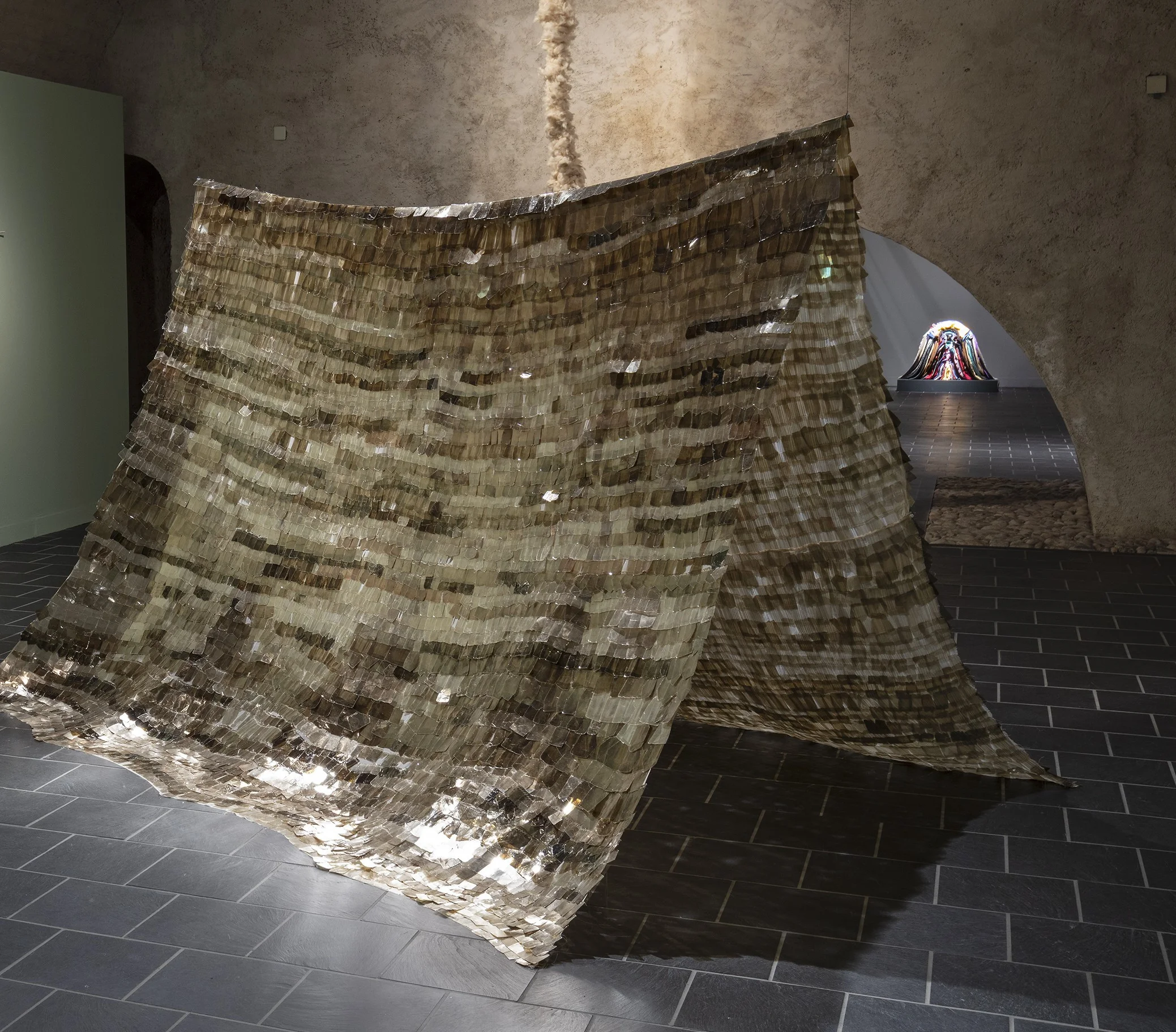 In ihrer präzisen Auswahl der vielseitig interpretierbaren Materialien, die Isabelle Krieg verwendet, ist die Künstlerin der italienischen Arte-Povera-Kunst der 1970er Jahre und auch ihrem Naturbezug verwandt. Auch in anderen Arbeiten greift die Künstlerin zu Materialien von ähnlich archaisch anmutender Ausdruckskraft: Ein Zelt als schlichte Urform der schützenden Behausung, das Isabelle Krieg «Hope Tent» (2023) nennt, setzt sie aus dünnen, lichtdurchlässigen, isolierenden und auf Chiffonseide aufgenähten Glimmer-Lamellen – Schichtsilikate – zusammen; sie verwendet damit ein Material, das glänzende Schönheit ausstrahlt, dem aber auch ein mehrdeutiger Symbolcharakter zukommen kann.