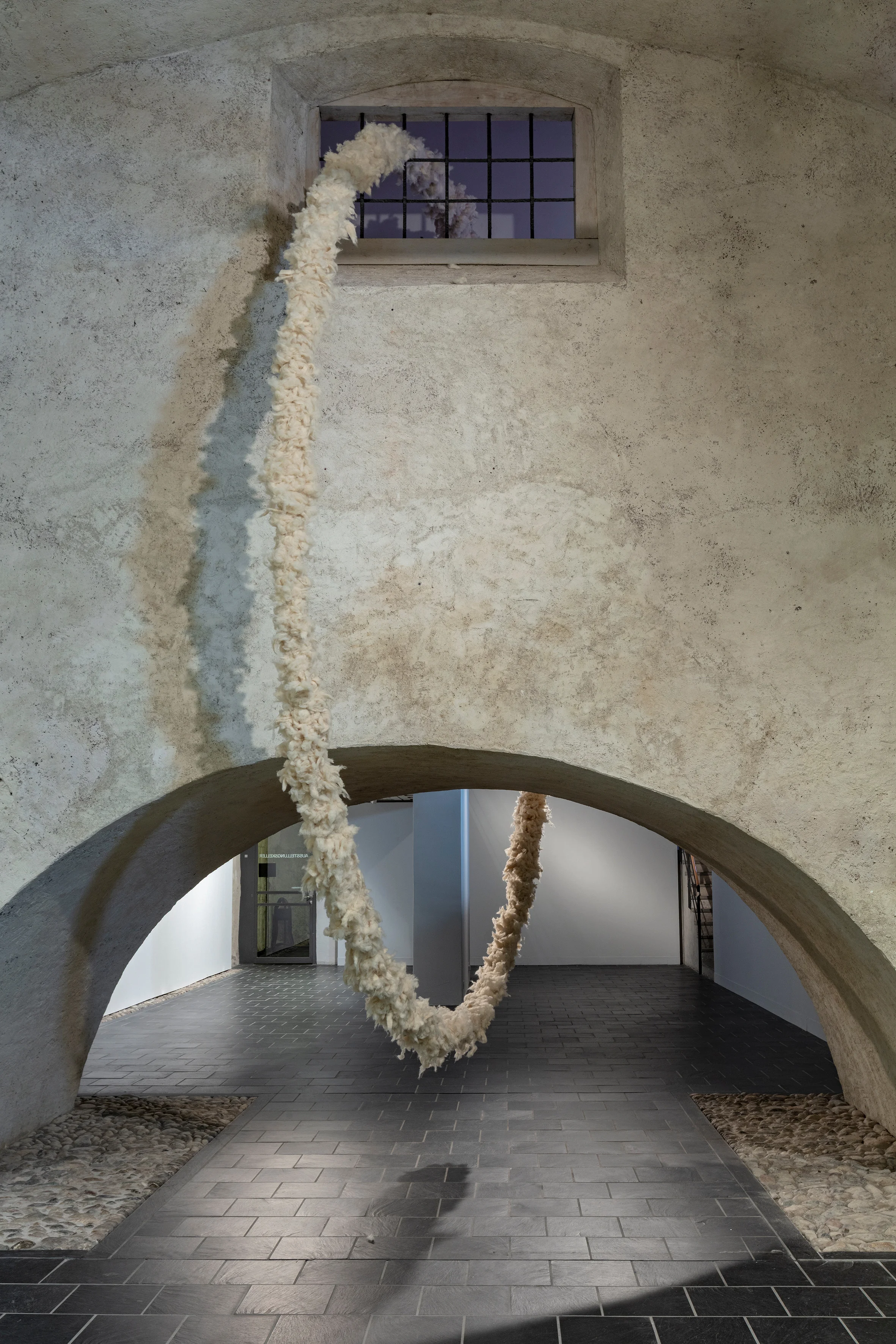 Der Boden des gewölbten Kellerraumes, den der amerikanische Konzeptkünstler Joseph Kosuth im Jahr 1999 mit einer dauerhaften sprachlichen Konzeptarbeit versehen hat, ist mit Schafwolle ausgelegt – mit einem organischem Material, das den Schall dämpft und unter unseren Schritten ebenfalls dämpfend nachgibt. Dieses Material kann als Gegensatz einerseits zur präzisen Form der Eier empfunden werden, gibt aber andererseits dem kühlen und hart-steinernen Kellerraum (er diente dem Kloster, das im 18. Jahrhundert einen schwungvollen und weiträumigen Weinhandel betrieb, als Weinkeller) eine weiche und fast wohnliche Wärme.