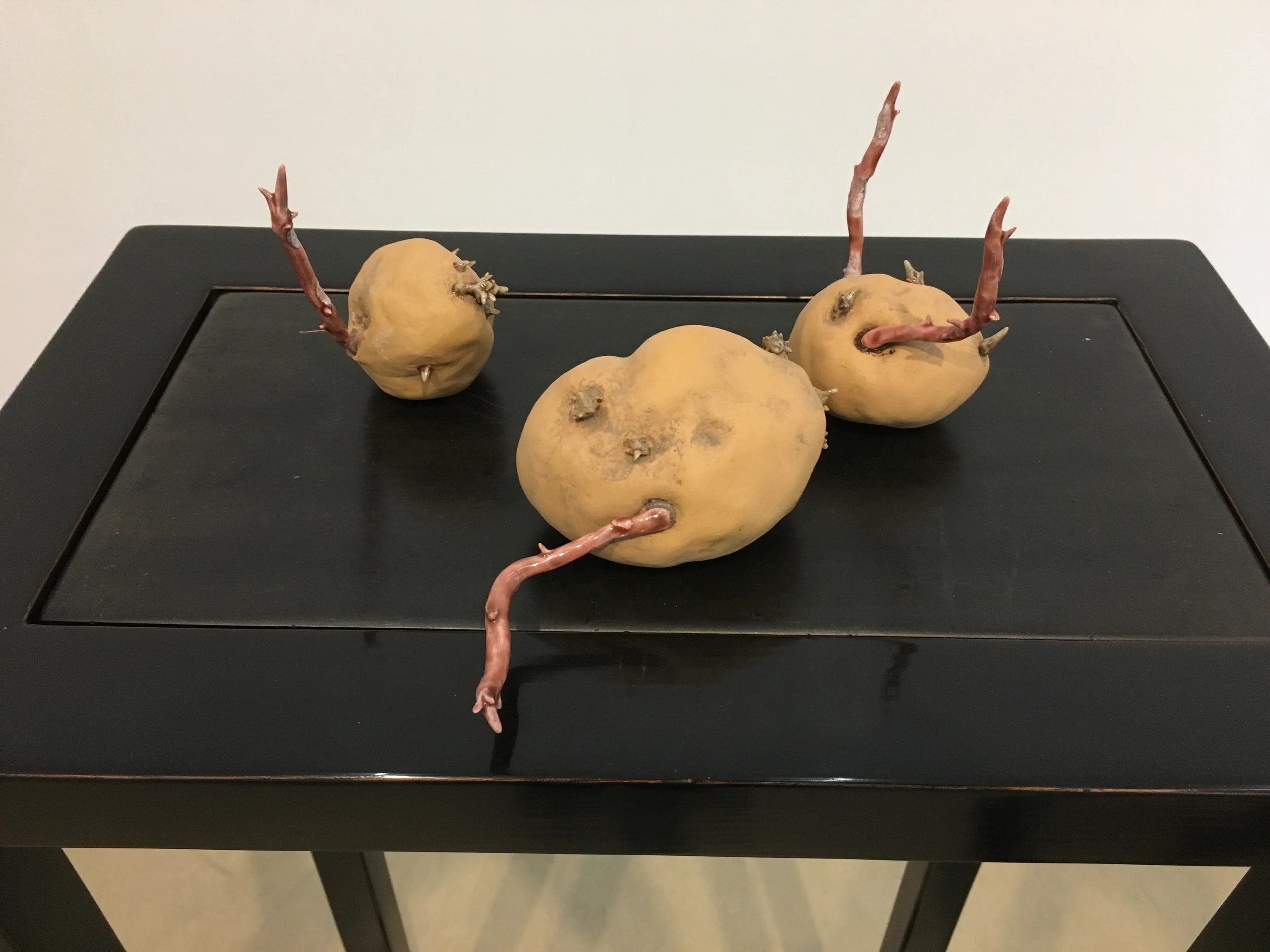 Beide Versionen von „A Whole Universe“, aber auch die auf modernen Sockeln präsentierten Meditationssteine zeigen Su-Mei Tses Tendenz, natürliche Prozesse in ihrer Zeitdimension in ihr Schaffen einzubeziehen. Sie tut das so, dass man von einer Haltung der Ehrfurcht sprechen möchte. Das gilt auch von den Klein-Skulpturen „Das Ich in jeder Kartoffel“, in denen die Künstlerin einem der banalsten Natur-Produkte, der Kartoffel eben, eine eigene und diese Banalität durchaus sprengende Individualität und Aura zu geben scheint. Es handelt sich um bis auf die Erdreste auf der Schale täuschend echt gemachte Keramik-Kartoffeln, aus denen glänzend glasierte Keime spriessen. Diese „Kartoffeln“ zelebriert sie in einer Art Altar-Situation auf sorgfältig gestalteten Sockeln, die mit antiken Steinplatten belegt sind.
