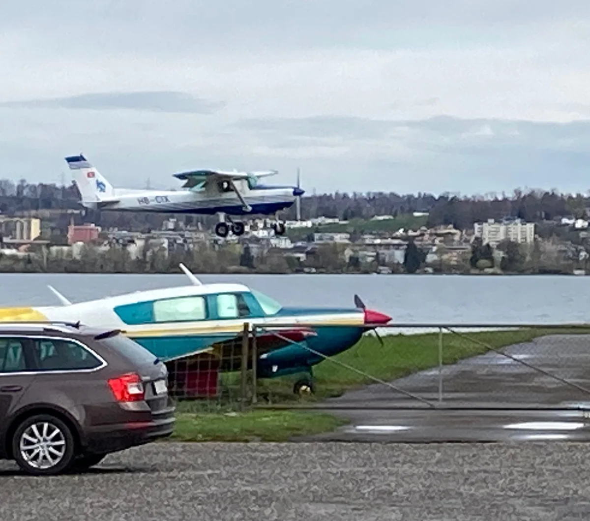 Rechts dehnt sich das weite Ried gegen Nuolen aus, auf dem Arbeiter (des Kantons?) damit beschäftigt sind, Elektrozäune zu montieren. Ein Plakat erklärt, dass hier die Wiederansiedelung der selten gewordenen Kiebitze geplant sei. Auf der anderen Seite meines Weges, nur wenige Hundert Meter seewärts, erklingt das tiefe Brummen eines Sportflugzeugs. Für einen kurzen Moment sehe ich es, wenige Meter über dem Boden schwebend, dann verschwindet es hinter dem Clubhaus des Flugplatzes Wangen-Lachen. Ich höre, wie der Pilot den Motor wieder auf Touren bringt. Offenbar wird das Durchstarten geübt.