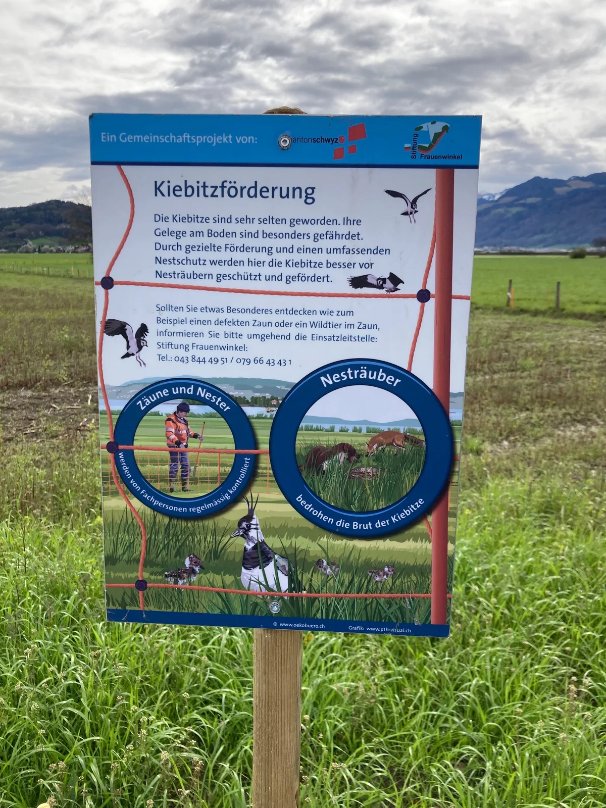 Erstaunlich: Die 500 Meter lange Piste des Sportflugplatzes liegt mitten in einer ehemaligen Riedlandschaft. Ich ertappe mich bei der Frage, ob ich mich nun als Naturschützer darüber empören oder umgekehrt stolz sein sollte, dass die kleine Schweiz es fertigbringe, auf kleinstem Raum verschiedensten Bedürfnissen gerecht zu werden. – Ich weiss es nicht, hoffe, die Kiebitze, falls sie sich die Aufforderung auf dem Schild des Kantons zu Herzen nehmen und hier siedeln, können sich mit der grösseren Konkurrenz kollisionsfrei arrangieren. Vielleicht sollten die Betreiber des Flugplatzes kiebitztaugliche Funkgeräte an die Vögel verteilen. Ob sich umgekehrt Flugzeuge von Elektrozäunen im Zaum halten lassen?