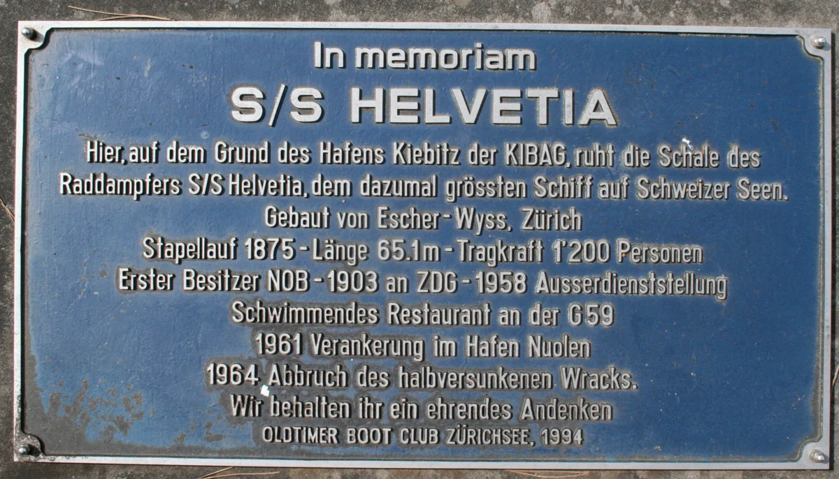 Es ist nicht klar, was danach geschah und wer dafür die Verantwortung trägt. Jedenfalls sank das Schiff wegen eines Lecks schon bald auf Grund. Halb geflutet bildete die einst stolze Helvetia ein jämmerliches Bild. Erst als das Bundesgericht urteilte, der letzte Besitzer sei für den ordnungsgemässen Abbruch des Schiffes verantwortlich, beauftragte Schwarz im Jahre 1964 die Kibag mit deren Verschrottung. Die Schale des Schiffs blieb allerdings auf dem Grund der heutigen Marina «Kiebitz» (!) liegen und wurde 1994 von Mitgliedern des «Oldtimer Boot Clubs Zürichsee» wiederentdeckt. Eine Gedenktafel erinnert an sie.
