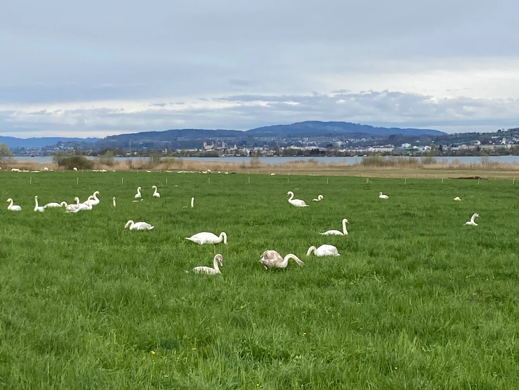 Ich wandere weiter ostwärts und freue mich darüber, dass sich zumindest andere Bewohner des Rieds an den Flugbetrieb gewöhnt haben. Auf der Wiese vor der Ryffelbucht «weiden» Schwäne. Über hundert habe ich gezählt. Und dann tauchen die ersten Häuser von Nuolen auf. Ich kann mich nicht erinnern, je hier gewesen zu sein, aber das kleine Dorf am westlichen Rand des Buechbergs, das zu Wangen gehört, ist mir seit meiner Jugend ein Begriff, wenn auch nicht unbedingt ein guter. Mich mit dem Dorf und seiner Kiesgrube zu versöhnen, könnte zu einer Art Nebeneffekt meiner heutigen Wanderung werden. Wieso?