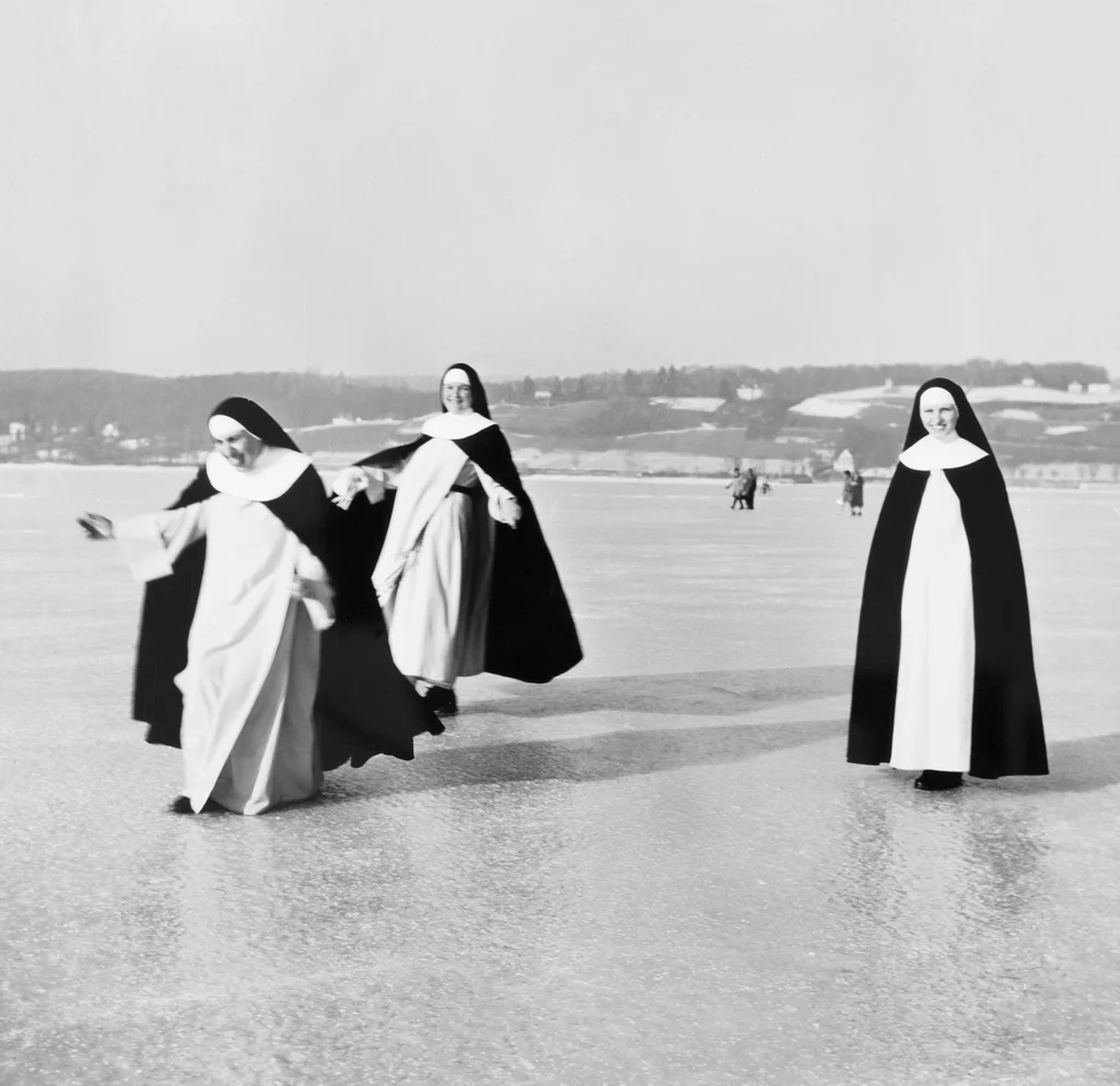 Vor 50 Jahren: Nicht nur der Zürichsee war vollständig zugefroren. Das Bild vom Februar 1963 zeigt drei Dominikanerinnen aus Konstanz, wie sie sich auf dem Bodensee vergnügen. (Aus dem Foto-Archiv der Agentur Keystone/Verlag Friedrich Stadler/Heinz Finke)