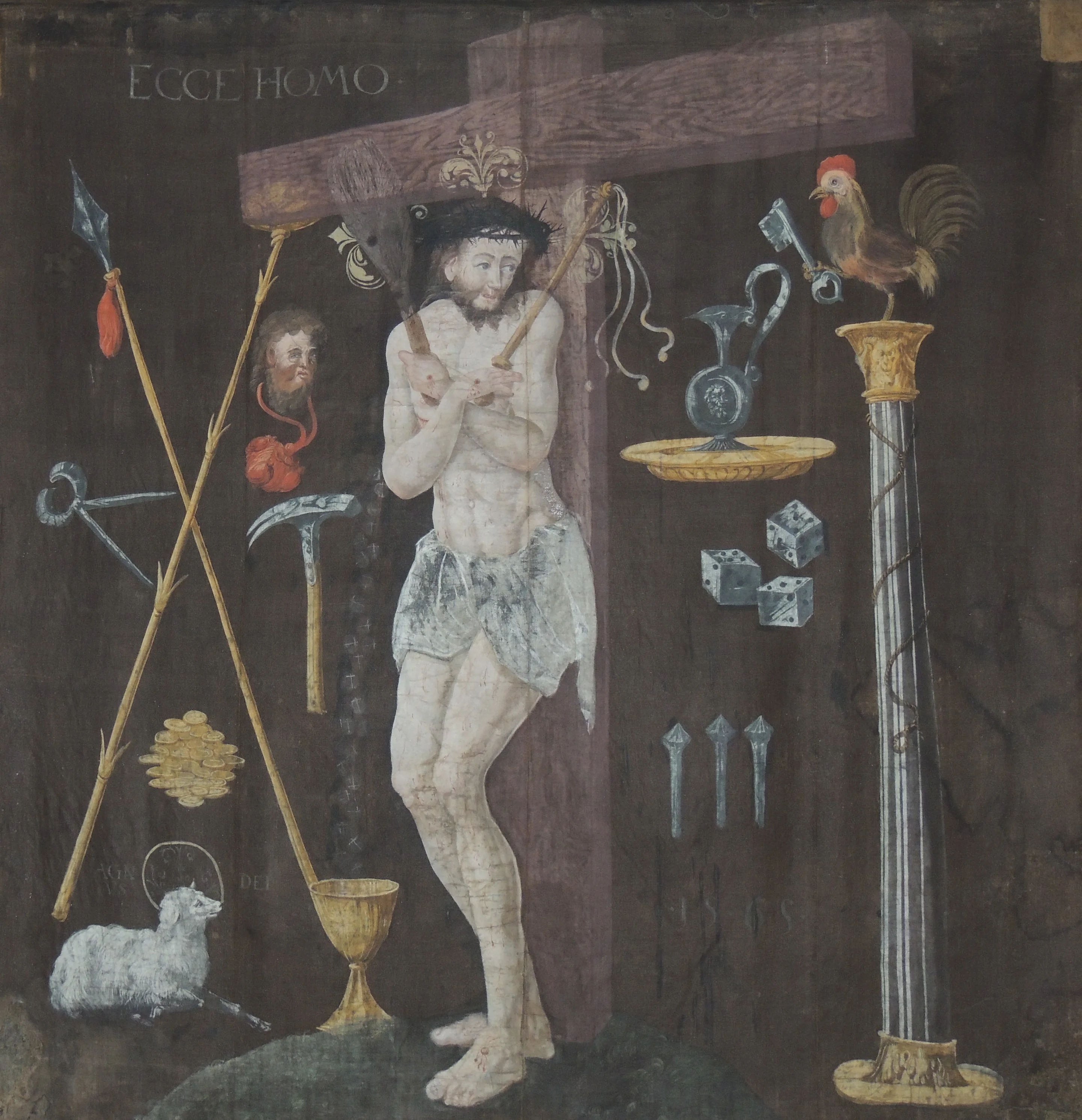 Die Reihung der Insignien religiöser und politischer Gewalt lassen die Christus-Figur besonders schutzlos erscheinen. Sie ist nackt dargestellt und beschämt mit aneinander gepressten Beinen. Ecce homo: Seht da diesen Menschen, ausgeliefert der offenen Gewalt, der Demütigung und dem Verrat.