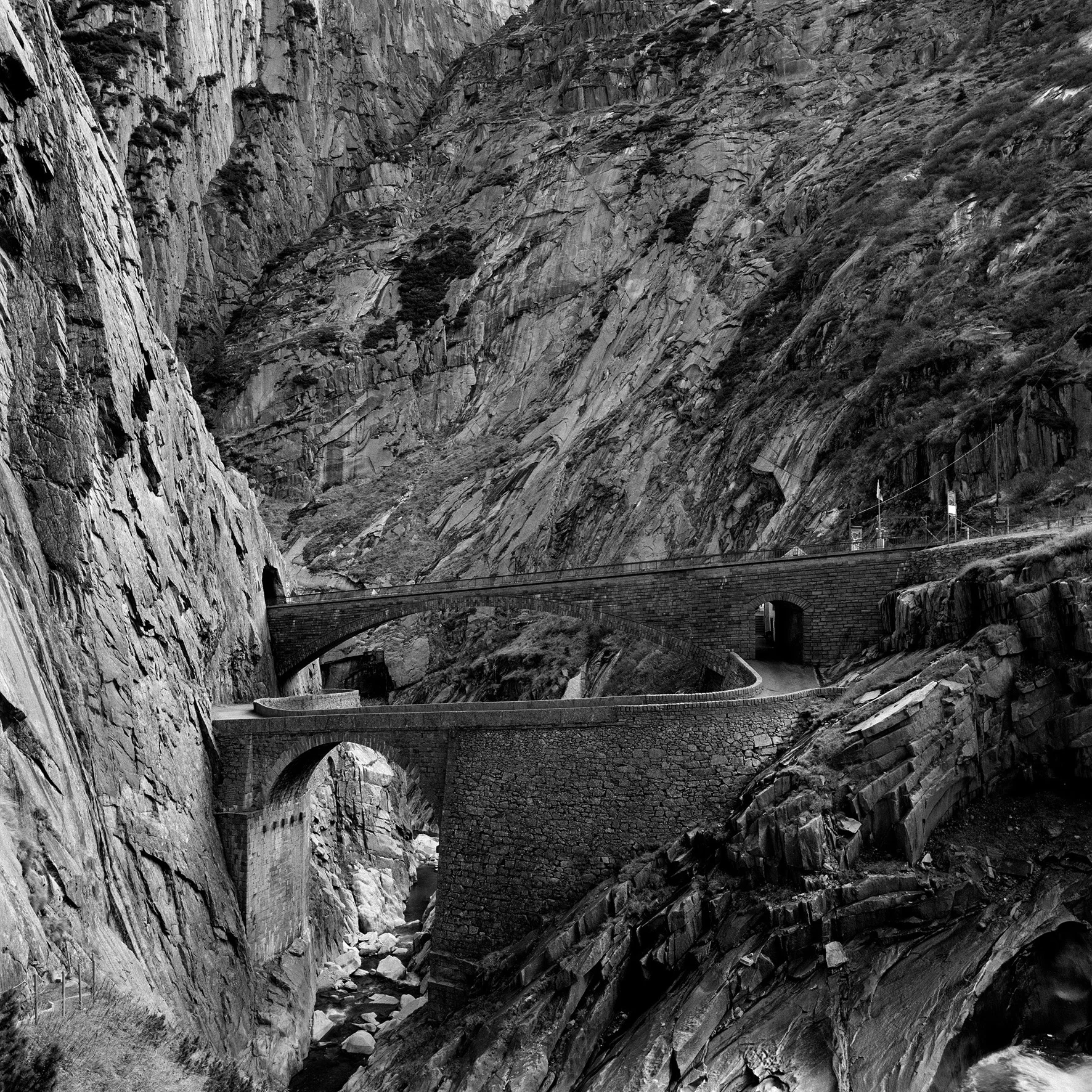 Tscharner erkundete nun mit seiner Kamera die Pässe in ihrer kargen Landschaft, Möri erklärte ihm die historischen Zusammenhänge, und auf die Weise sind Bilder und Texte von grosser Eindringlichkeit entstanden. In dem Band hat Tscharner zwei Fotostrecken untergebracht: Die erste ist schwarzweiss, die zweite farbig. Die Schwarzweissbilder hat Tscharner so gefiltert, dass dunkle Grautöne überwiegen und jedes einzelne Bild daran erinnert, wie mühsam es einmal gewesen sein muss, diese Passagen in die unwirtliche Gebirgslandschaft einzubringen.