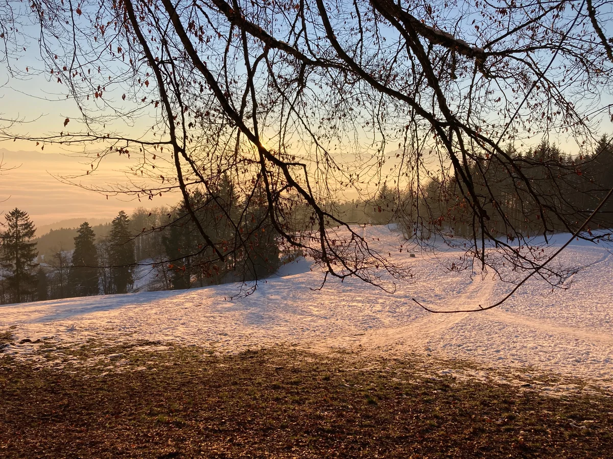 Wieder zuhause suche ich in meiner digitalen Fotosammlung nach Bildern, welche ich im Laufe der Zeit vom «letzten Tor» aus aufgenommen habe. Sie reichen gerade zehn Jahre zurück, denn in der Vor-Handy-Zeit hatte ich den Fotoapparat nur für besondere Ausflüge dabei, kaum für einen Abendspaziergang auf der Hochwacht. Doch viel hat sich hier während der letzten Jahrzehnte ohnehin nicht verändert. Mein Blick bleibt an einer Aufnahme vom 21. März 2014 hängen. Wie auf einem Barockbild schiessen die Sonnenstrahlen hinter einer grauen Wolke hervor und lassen den Obersee hell aufleuchten. So müssen Menschen seit Urzeit in den Himmel gestaunt und sich ihren Glauben zurechtgelegt haben.