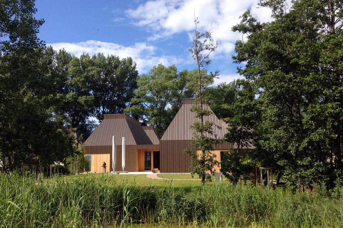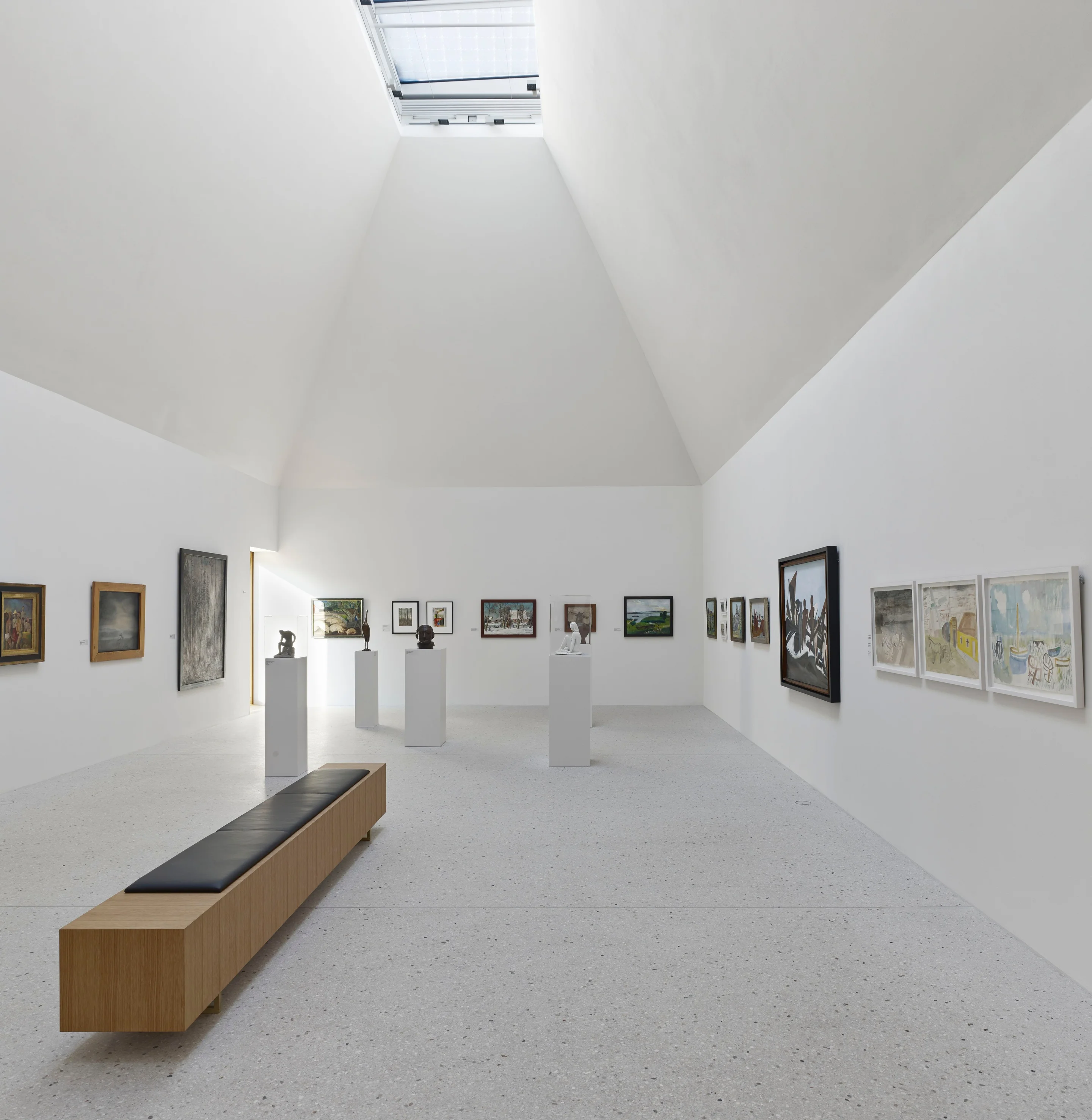 Doch Staabs Museum imitiert nicht, betreibt keine Mimikri. Das Reet auf den umliegenden Dächern wird auf den Museumshäusern zum unregelmässig plissierten Messing. Den Aussenwänden ist das gleiche Material vorgehängt, und auf dem First der Walmdächer sitzt ein wiederum senkrechter Aufbau. Er erinnert visuell an die Reet-Überstände der traditionellen Dächer, birgt aber die raffinierte Tageslicht-Technik der weitgehend fensterlosen Ausstellungsräume. Die bei der Eröffnung noch goldglänzenden Messingflächen sind nach einem Jahr in vorgesehener Weise durch Oxydation nachgedunkelt und werden sich noch weiter verändern – wie Reetdächer das auch tun. Staabs Museumshäuser strahlen Strenge, ja eine formale Radikalität aus, aber sie trumpfen nicht auf, sondern ordnen sich ein. Das Museum will an diesem Ort etwas Fremdes sein – aber doch ganz unzweifelhaft an diesen Ort gehören.