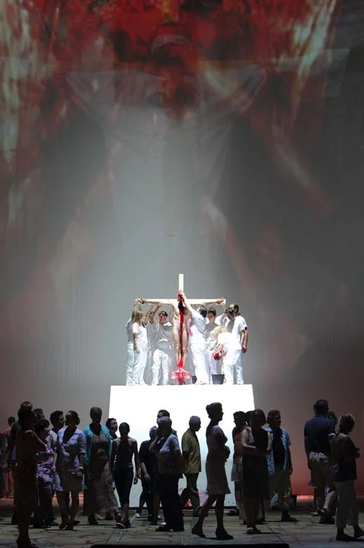 Aber mit einer grossartigen Inszenierung. Der Wiener Aktionist Hermann Nitsch ist ein passionierter Verehrern von Messiaen: „Seine gleichzeitige Aufarbeitung von Atonalität und Tristanromantik, berauscht mich, seine Orgelmusik begeistert mich eben so sehr wie seine Liebe zu den Vögeln. Auch seine tiefe Religiosität beeindruckt mich sehr, obzwar ich ein anderes Verhältnis zur Religion habe.“