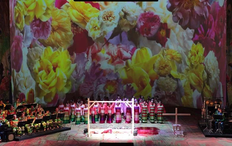 Monumental auch der Klang. Der Orchestergraben ist bis zum Bersten gefüllt, eine Bläsergruppe dazu links auf der Bühne, der Perkussionsblock rechts. Die Direktionslogen rechts und links der Bühne zusätzlich mit Musikern besetzt. Mehrere Chöre singen. So wird eine Klangfülle erreicht, die annähernd dem entspricht, was Messiaen für seine Musik vorschwebte. Ähnlich Hector Berlioz’ „Symphonie fantastique“, die wahrscheinlich nur einmal, und dies zur Eröffnung der Zürcher Festwochen, der Partitur gemäss aufgeführt wurde: Die Tonhalle war gefüllt mit vier Orchestern, mehrere Chöre sangen. Die Musik wurde per Lautsprecher, die auf Plätzen, Häusern und Schiffen angebracht wurden, übertragen und spannte über Zürich und den angrenzenden See eine Klangwolke.