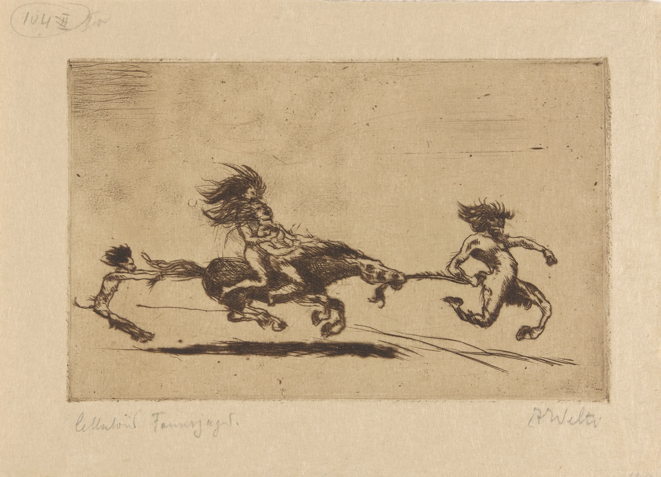 Weltis Sujets sind Hexen, Pegasus, Amazonen und andere mythologische Gestalten, Gespenster, Kobolde und anderweitig Zwielichtiges. Ein geradezu fulminantes, aber auch doppelbödiges Blatt nannte er «Faunsjagd». Es misst nur 9 auf 14 cm und zeigt skizzenhaft hingeworfen ein galoppierendes Pferd. Eine zerzauste Gestalt zieht es vorwärts und eine zweite hält es zurück. Was der Inhalt des Blattes ist, lässt sich nicht genau ausmachen. Liess der Künstler sich von Witz- und Unterhaltungsblättern anregen? Ging es ihm nur um Eskapade und Exaltiertheit? Wichtig schien ihm aber in erster Linie der Gaul selbst in extremer Position – eine Erinnerung vielleicht an den väterlichen Pferdetransport-Betrieb Welti-Furrer in Zürich, für den sich Welti mitunter als Werbegrafiker betätigte. Die «Faunsjagd» gestattete ihm aber eine weit exzentrischere Zeichnung als die Reklame. Der Gedanke an private Fantasien oder an die reine Lust am Fabulieren, die keiner Rechtfertigung bedarf, drängt sich auf.