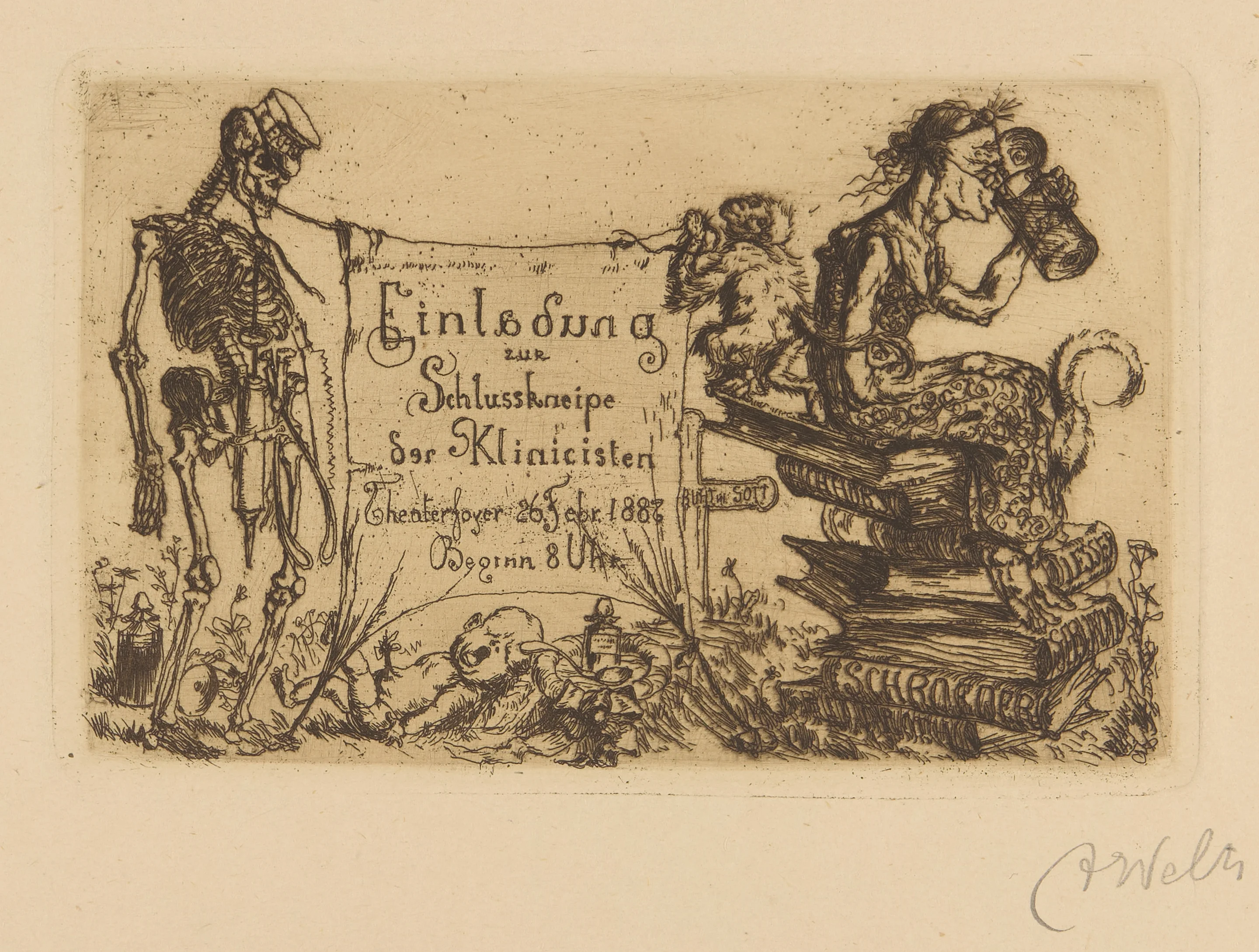 Auch das kleine Blatt «Einladung zur Schlusskneipe der Klinicisten» (1887) mit Skelett links und Bier trinkendem Studenten rechts mischt allerhand Fantastereien auf, bleibt allerdings im thematischen Umfeld der Auftraggeber, einer studentischen Verbindung angehender Mediziner. Nahe bei Auftraggebern und ihren privaten Interessen und Vorlieben blieb er auch, wenn es um «Exlibris»-Gestaltungen für Freunde und Bekannte ging.
