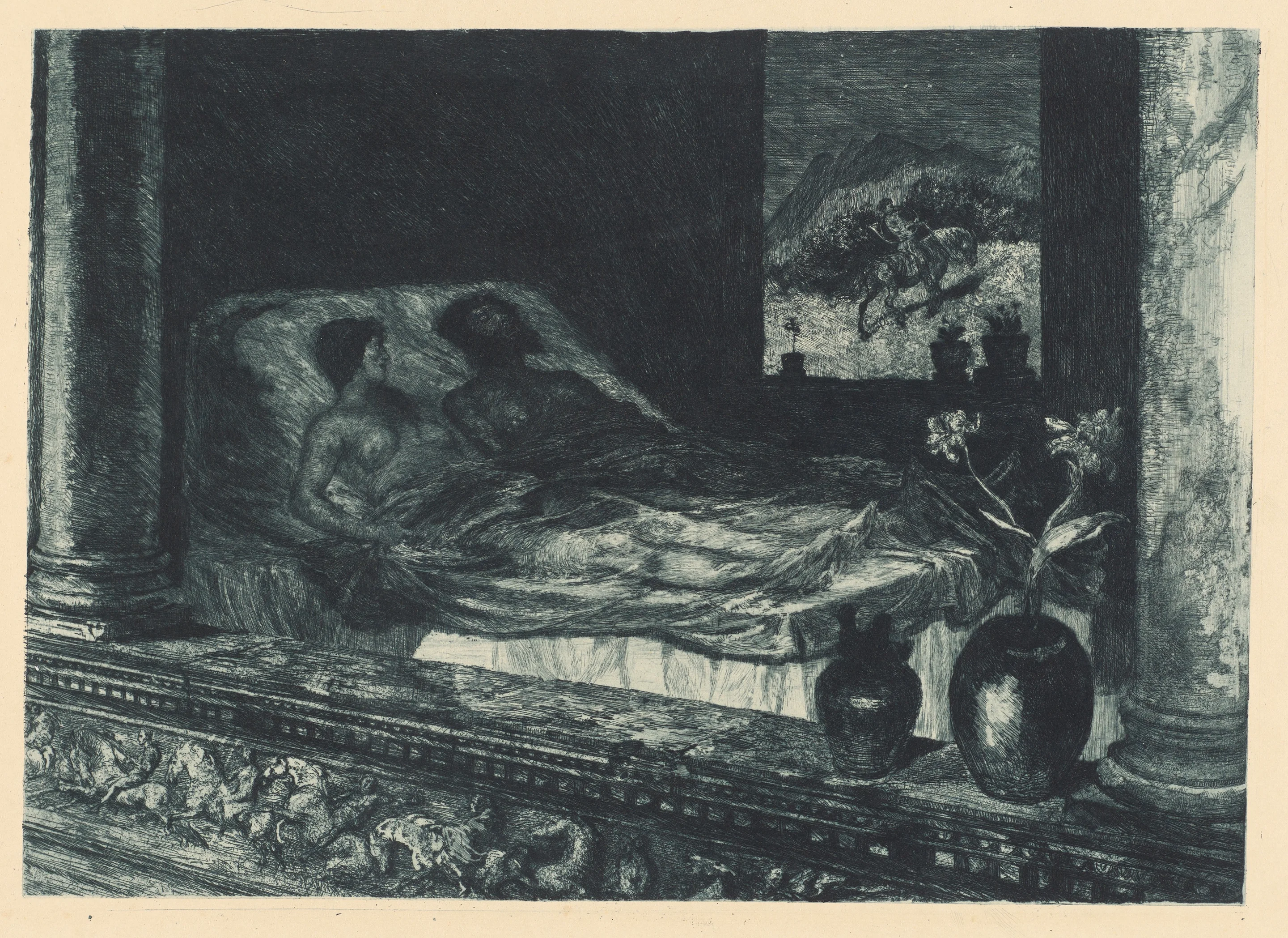 Hohe Könnerschaft, sowohl technisch in den Tonwerten zwischen Hell und Dunkel als auch in der inhaltlichen Komplexität zeigt sich auch im respektabel grossen Blatt «Die Fahrt ins 20. Jahrhundert», in dem sich Welti auch als Meister des «Wimmelbildes», der Choreografie der Massen, profiliert. Ähnlich «Die Mondnacht» von 1896: Die Radierung mutet beinahe gespenstisch an. Fast die Hälfte des Blattes ist schwarz. Auf dem Bett liegen ein Mann und eine Frau. Der Mond wirft sein milchiges Licht auf die Beine des Paars, das draussen einen Reiter vorbeiziehen sieht. Albert Welti scheint uns in Ansätzen eine Geschichte zu erzählen, die er uns weiterzuspinnen einlädt, ohne uns aber zu verraten, welche Richtung er einzuschlagen gewillt ist. Alles bleibt in der Schwebe. Ungehemmt bricht des Künstlers Fabulierlust auf an den Rändern eines undatierten Blattes, auf die Welti verschiedene Probeätzungen appliziert. Hier scheinen die zeichnerischen Einfälle des Künstlers keine Grenzen zu kennen. Da setzt Welti feinste Linien, Rasterungen und Tonwerte ein, um das Experimentieren auf die Spitze zu treiben. In der Neujahrskarte für 1903 mit von Männern bestaunten Frauen glänzt er mit dem heute nicht mehr ganz stubenreinen Spruch «Die Weiblein sind die Freuden, die vom alten Jahr ins neue kommen ohne Gefahr».