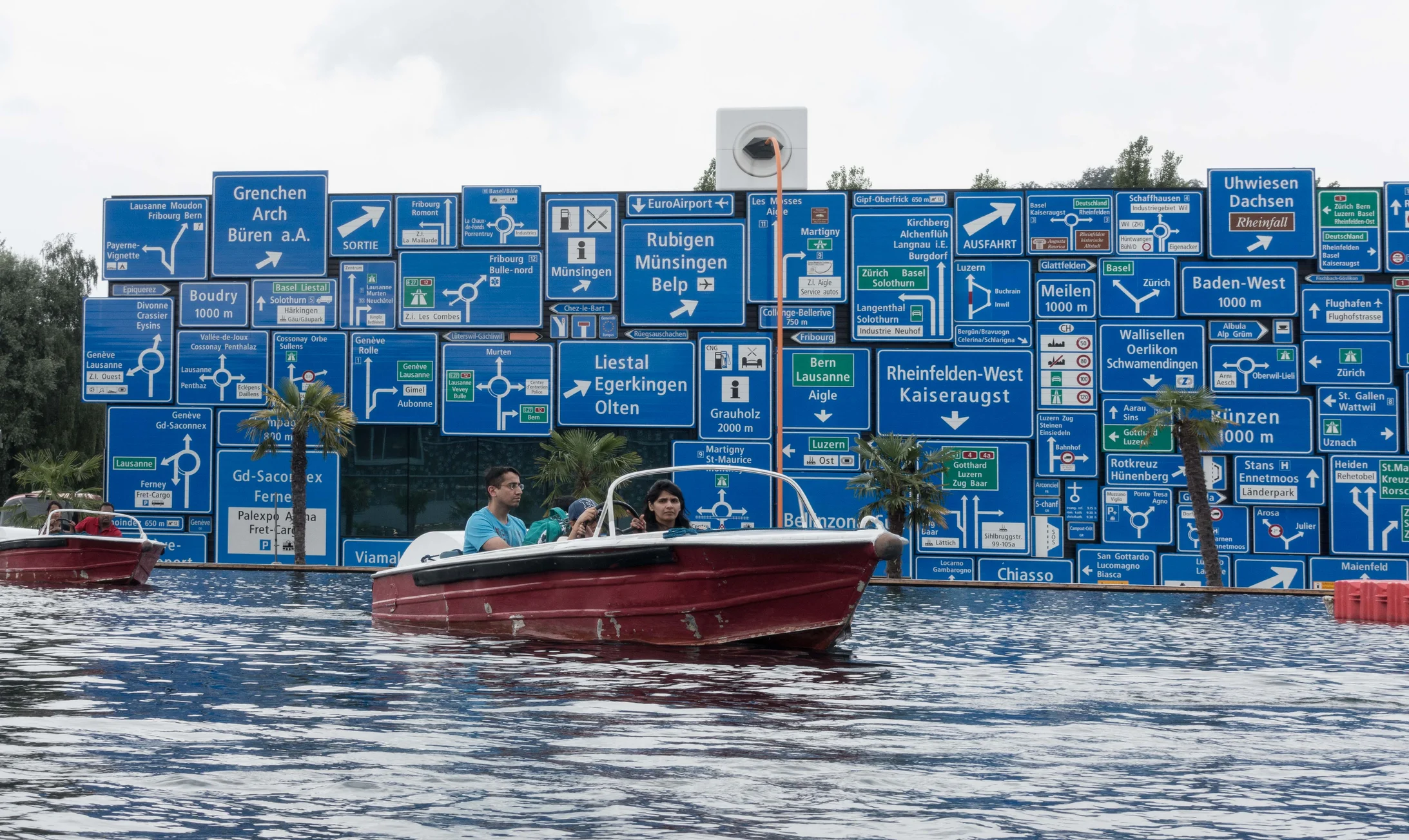 Der Weg zur Halle mit den Flugzeugen enthält eine Reihe von Überraschungen. So kommt man an einem grösseren Bassin, Arena genannt, vorbei. Wie in einem surrealen Film bewegen sich darauf kleine Boote mit Besuchern. Im Hintergrund des Bassins erscheinen unzählige blaue Strassenschilder der Schweiz. Die Schweiz – real und surreal in einem, sich selbst ein bisschen parodierend und dabei liebenswert.