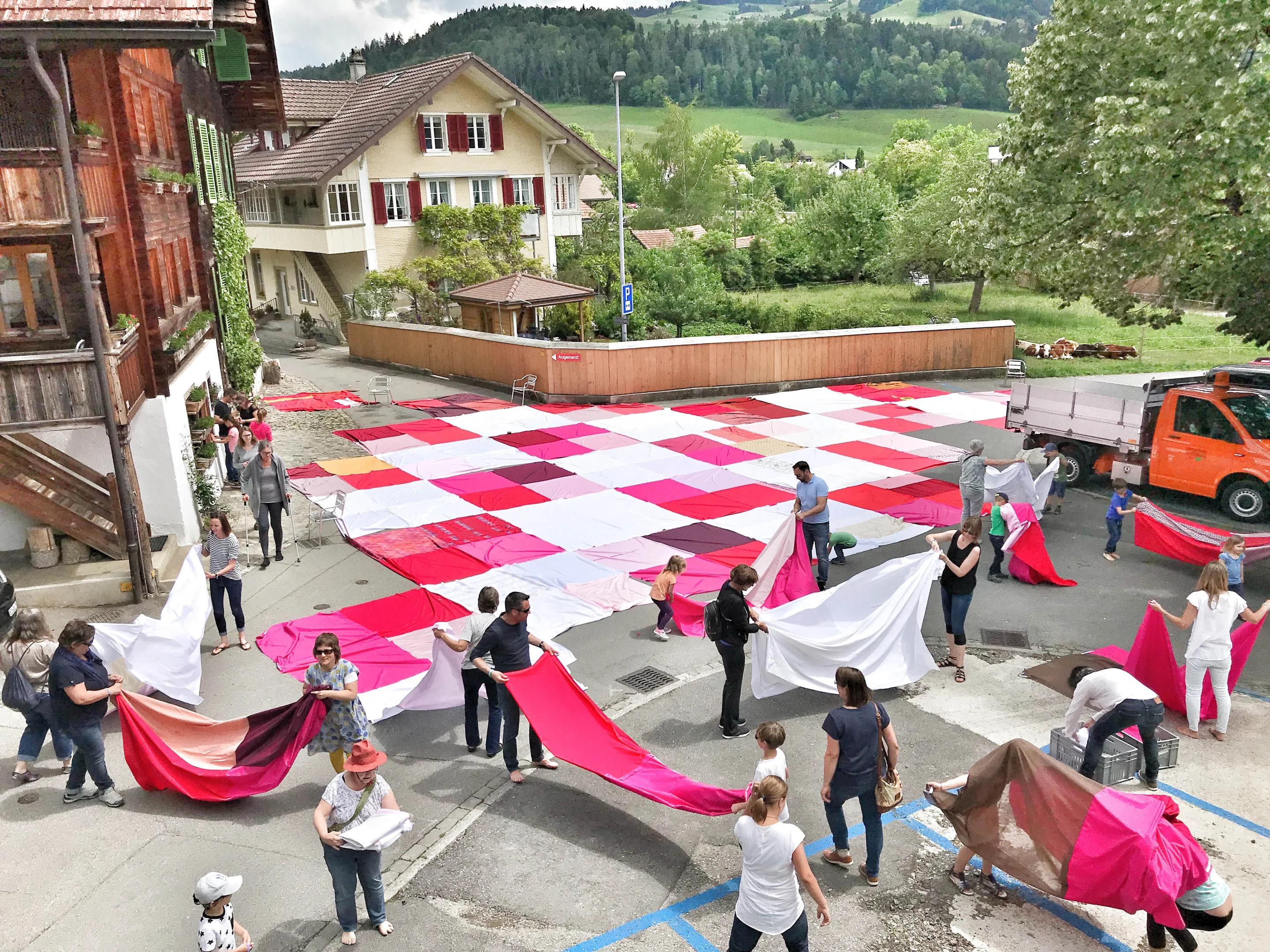 Ausgelöst hat diese sinnliche Vertiefung in die Geschichte eine Kunstaktion der Brüder Frank und Patrik Riklin vom St. Galler Atelier für Sonderaufgaben. Immer wieder machen sie mit originellen Kunstaktionen von sich reden, etwa mit dem Null-Stern-Hotel. Die Aktion, um die es hier geht, ist 2012 gemeinsam mit der Organisation für Regionalentwicklung Appenzell Ausserrhoden-St. Gallen-Bodensee entstanden; sie trägt den Titel «Bignik» und soll erst im Jahr 2050 an ihr Ende kommen. Die Idee: In gemeinsamem Sammeln und Zusammennähen wird ein immer grösser werdendes Picknicktuch gefertigt, bis 286’478 Tücher beisammen sind – so viele Einwohner hat die Region. Das Tuchprojekt wandert dabei von Ort zu Ort, am kommenden 12. Juni nun soll es in der Altstadt von St. Gallen ausgelegt werden. Das hat den Anstoss zur Ausstellung gegeben.