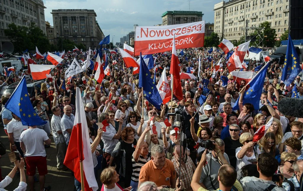 Unter anderem hatten drei frühere Präsidenten zu der Manifestation aufgerufen: Lech Walesa, Bronislaw Komorowski und Aleksander Kwasniewski. Allein in Warschau demonstrierten weit über zehntausend Menschen. Der Aufmarsch stand unter dem Motto: „Alle für die Freiheit“. "Wir beobachten mit Unruhe, wie Europa heute den Glauben an seine Träume und seine Stärke verliert", schrieben die drei ehemaligen Präsidenten in einer Botschaft. Mit der Demonstration wird auch an die ersten freien Wahlen am 4. Juni 1989 erinnert. Der nationalkonservative polnische Parteichef Jaroslaw Kaczynski bezeichnet die Demonstration der Regierungsgegner als „Rebellion“. Das Verfassungsgericht hatte im März die umstrittene Justizreform der Warschauer Regierung für verfassungswidrig erklärt. Die Regierung erkennt das Urteil jedoch nicht an. Kaczynski wirft dem Verfassungsgericht Verfassungsbruch vor. (Foto: Keystone/EPA/Jakub Kaminski)