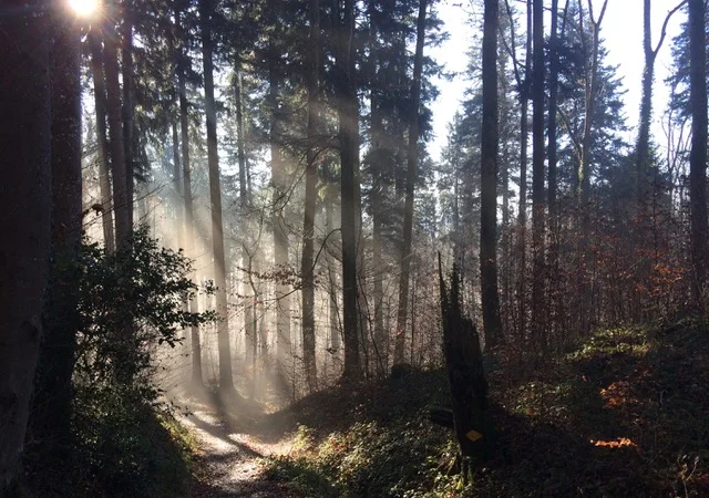 Mein heutiges Ziel ist die südliche Albiskette. Der breite Weg führt einer Weide entlang hinauf zum Wald. Zwischen den dunklen Stämmen der Fichten blendet mich immer wieder die tief stehende Sonne. Nach zwanzig Minuten erreiche ich den hölzernen Aussichtsturm auf der Hochwacht (877 m ü.M.). Das Stufenzählen ist schon fast zwanghaft: Acht Etagen à je 19 Stufen zähle ich beim Aufstieg. Aus geheimnisvollem Grund scheint die Primzahl 19 den Turmbauern heilig zu sein. – Auch der Turm auf dem Loorenchopf, eine ähnliche Holzkonstruktion, hat je 19 Stufen, allerdings nur 6 Etagen.