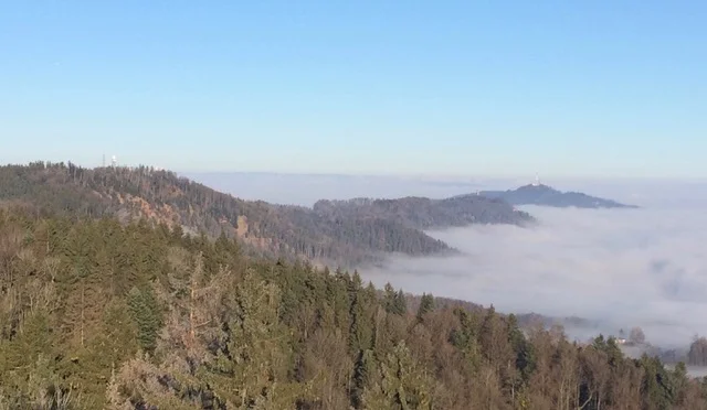 Auf der sonnenbeschienen Terrasse gönne ich mir einen Kaffee mit Apfelkuchen; für das Mittagessen ist es noch zu früh. Gestärkt wandere ich weiter der Krete entlang nach Süden. Nun geht es stetig bergab. Den „Oberen Albis“, ein stattlicher Hof, lasse ich rechts liegen. Später führt der Weg in einer weit gezogenen Kehre in die bewaldete östliche Bergflanke. Zwischen den Fichtenstämmen tauchen die ersten Nebelschwaden auf. Als ich beim Schweikhof aus dem Wald trete, sind der blaue Himmel und die schneebedeckten Alpen bereits Erinnerung.