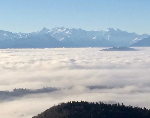 Oben geht mein Atem etwas kurz. Ich schreibe es der atemberaubenden Aussicht zu. Wie der gekrümmte Körper eines Drachens liegt der Albis im Nebelmeer.