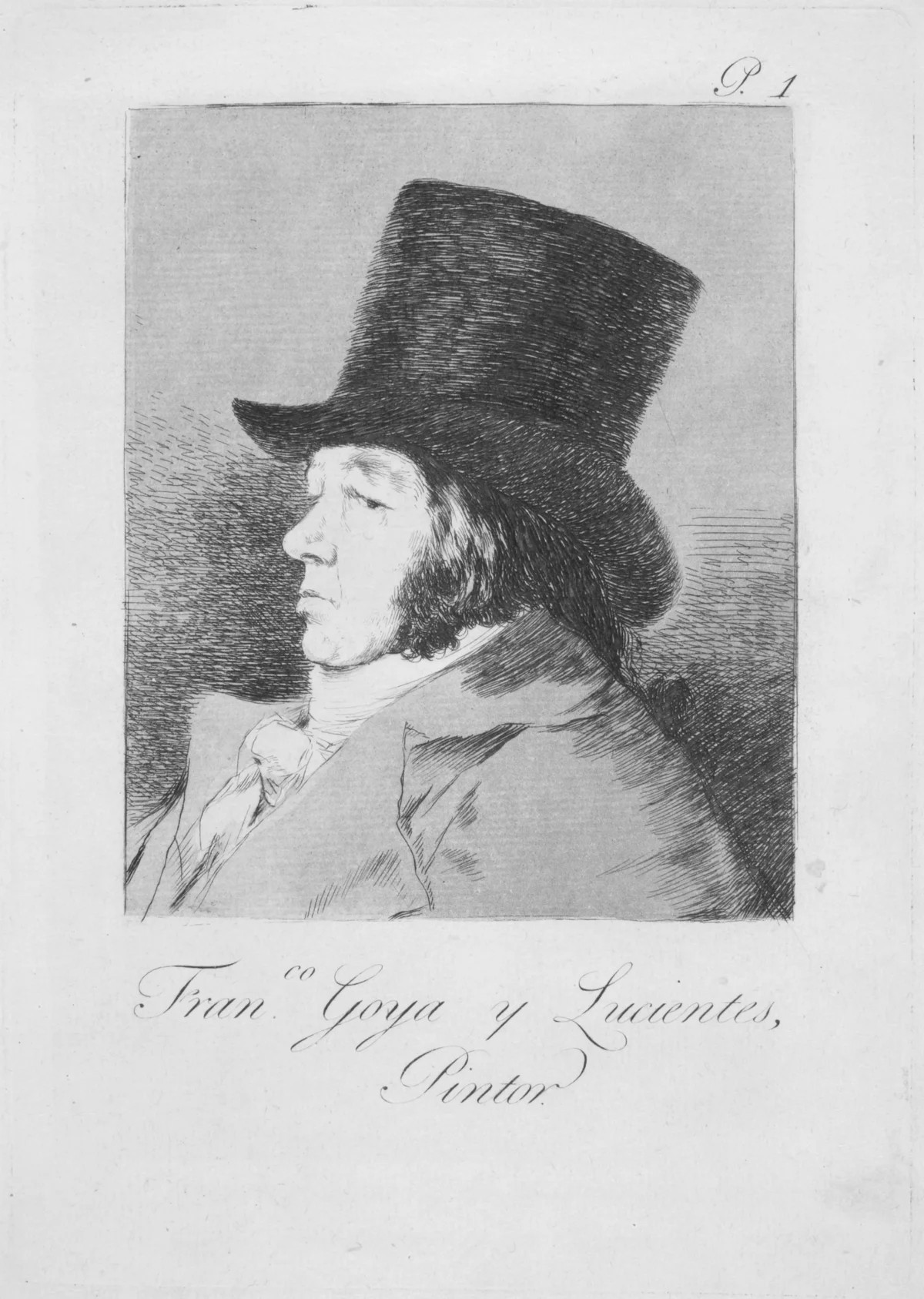 Auf dem ersten Blatt porträtiert Goya sich selbst. Er ist vornehm gekleidet und trägt den Zylinder, das damals aufkommende Accessoire des selbstbewussten Bürgertums. Im Halbprofil ist Goyas indignierter Ausdruck erkennen. Das Titelbild der Caprichos macht eine klare Ansage: Ich, Francisco de Goya, berühmter Künstler und freier Geist, halte euch hier den Spiegel vor, in welchem ihr eure Machenschaften, Unsitten und Torheiten, eure Beschränktheit und Niedertracht zur Kenntlichkeit verzerrt vor Augen geführt bekommt.