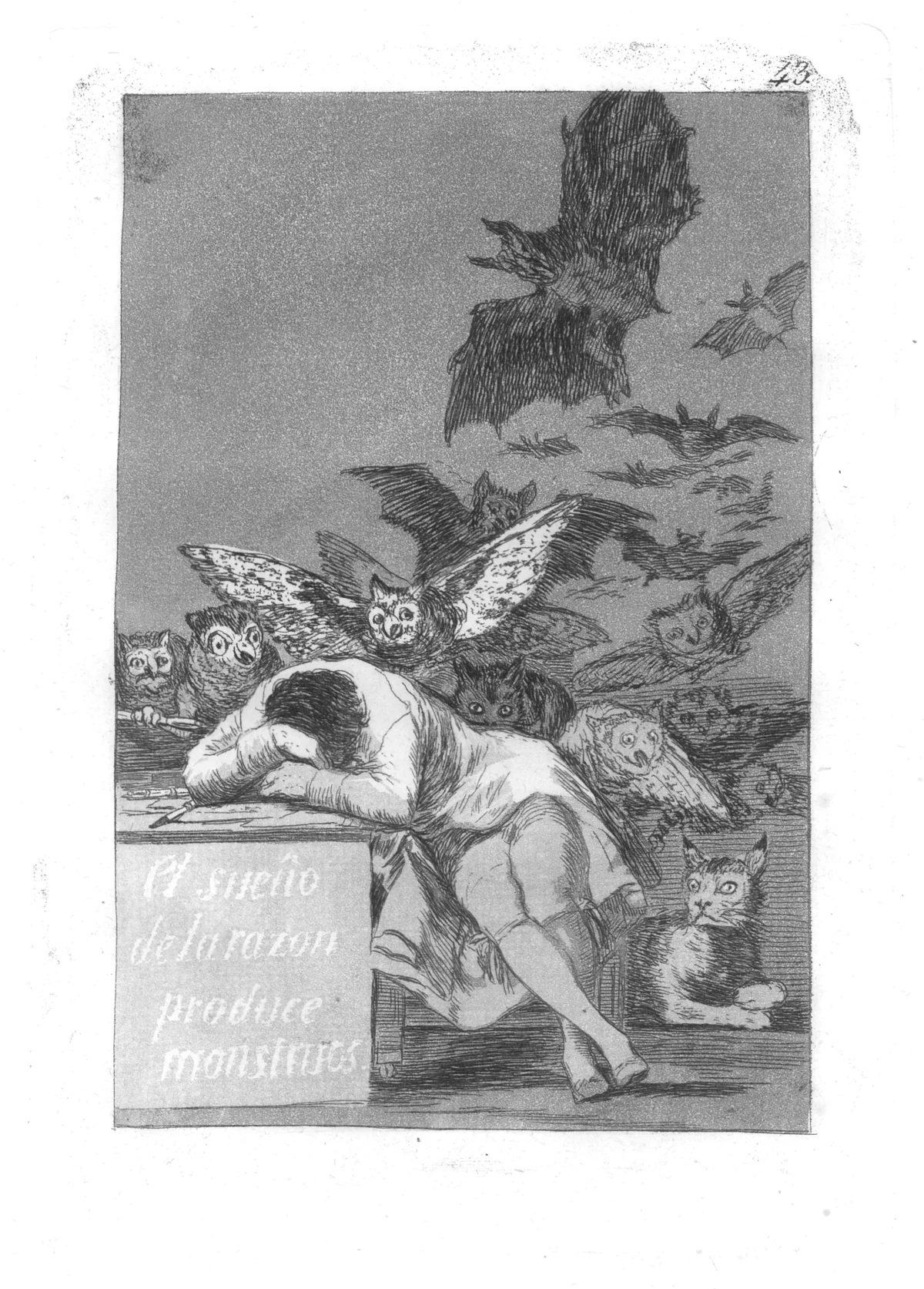 Goya hat dieses Capricho 43 ursprünglich als Titelblatt vorgesehen. Dies lässt darauf schliessen, dass es sich auch bei dem darauf dargestellten Schläfer um ein Selbstporträt handelt – hier nicht im Sinn einer physiognomischen Eigendarstellung, sondern als Illustration seiner geistigen Situation. Mit diesem Hintergrund bekommt das ikonische Blatt eine zusätzliche Brisanz: Goya versteht sich als aufgeklärter Mensch, der von den Monstern der Verdunkelung heimgesucht wird.