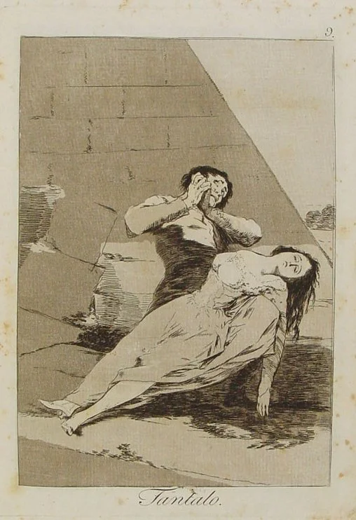 Geschlechtertypen sind für Goya nicht in Stein gemeisselt. So verschieben sich die Rollen in vielschichtiger Art auf Blatt 9 „Tántalo“: Der gegen die Götter frevelnde König Tantalos wird in der griechischen Mythologie in einer Weise bestraft, dass er zur sprichwörtlichen Verkörperung des unerfüllbaren Begehrens wird. Im Capricho 9 ist Tántalo der alte impotente Mann, der die erstorbene Sinnlichkeit der schönen jungen Frau nicht zu wecken vermag. Männliches Erobern fällt flach, dem Tántalo bleibt nur das weibische Jammern. Eine zusätzliche Rollenumkehr liegt in der deutlichen ikonographischen Anlehnung ans Motiv der Pietà, bei dem die trauernde Maria den toten Christus auf dem Schoss hält.