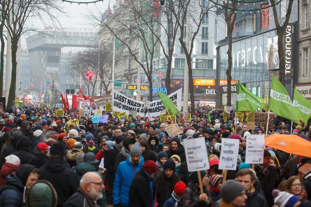 Nach Angaben der Polizei waren es 20’000; die Demonstranten sprachen von 70’000 Teilnehmern. Der Protest richtete sich „gegen Rassismus, Sozialabbau und Rechtsextremismus“. Der FPÖ, dem Koalitionspartner der ÖVP, werden teils rechtsextreme Tendenzen vorgeworfen. „Lasst Nazis nicht regieren“, hiess es auf Transparenten. Menschenrechtler warnten vor einer Wiederholung der Geschichte. Auch jüdische Gruppen nahmen an der Kundgebung teil. Der Start von ÖVP-Bundeskanzler Sebastian Kurz verlief harzig und unglücklich. Der Stern des einzigen Shootingstars droht schon wenige Wochen nach Regierungsbeginn zu verblassen. Bei einem Treffen mit Emmanuel Macron bettelte Kurz darum, ihm doch eine Chance zu geben. (Foto: Keystone/EPA/Florian Wieser)