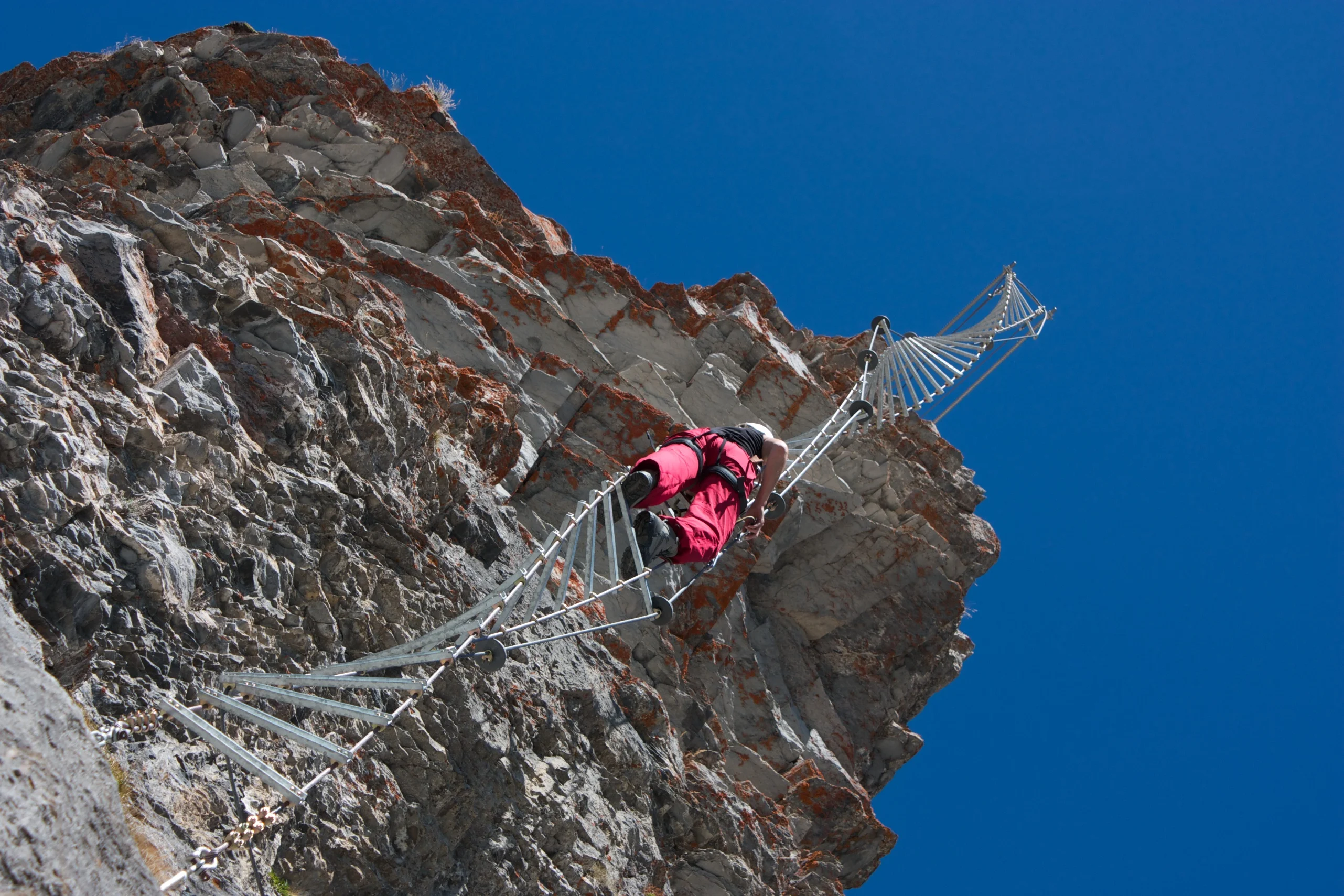 Klettersteige: Mit Drahtseilen und Tritten aus Stahl werden Felswände gangbar gemacht. Im ersten Weltkrieg dienten die Vie Ferrate als Nachschubwege der Gebirgstruppen. In den sechziger Jahren entdeckte sie der Tourismus. Damals gab es ein paar Dutzend Klettersteige, heute sind es im ganzen Alpenraum weit mehr als tausend. Österreich hat bereits 594 solcher Anlagen, Italien zählt 496, die Schweiz 165.