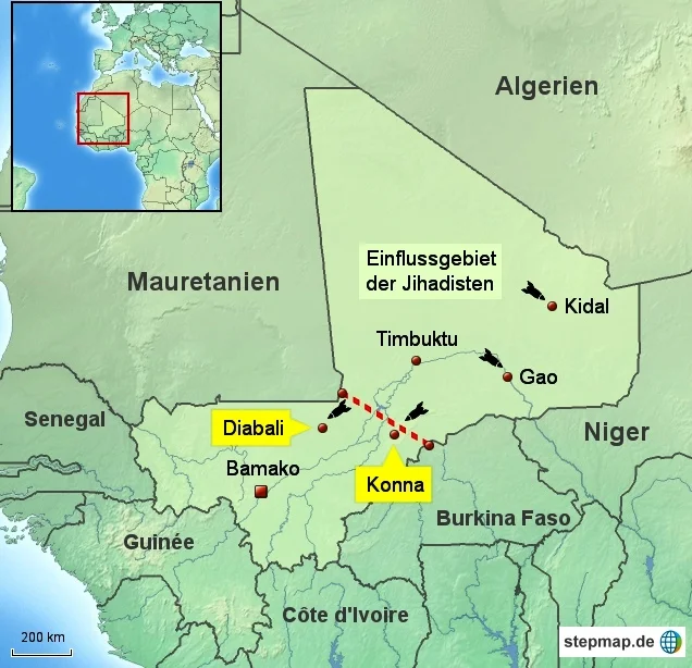 Erstes Ziel der Aktion ist es, die malische Hauptstadt Bamako vor dem Fall zu schützen. Dort leben 6‘000 Franzosen. In zweiter Linie soll die Front, die bei der Stadt Konna liegt, gesichert werden. Drittens wollen die Franzosen zusammen mit afrikanischen Truppen der malischen Nachbarländer versuchen, die Jihadisten nicht nur zurückzudrängen, sondern ganz zu vertreiben.
