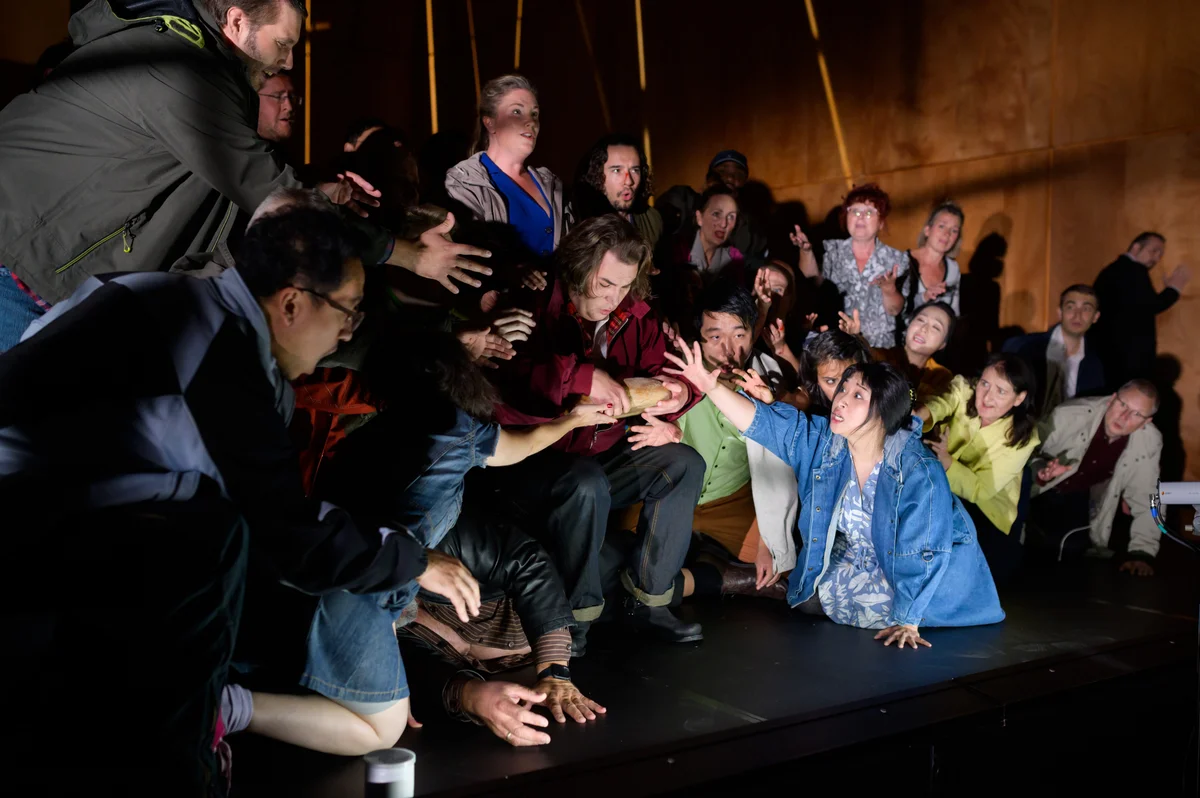 Auch wenn der Stoff aus dem Alten Testament stammt, auf der Bühne findet die Handlung im Heute statt. Das Volk trägt Jeans und einfache Alltagskleider, von Reichtum ist nichts zu sehen. Ist es Naher Osten? Vielleicht. Aber nichts deutet explizit darauf hin. Es spielt im Irgendwo, und Irgendwo ist überall.