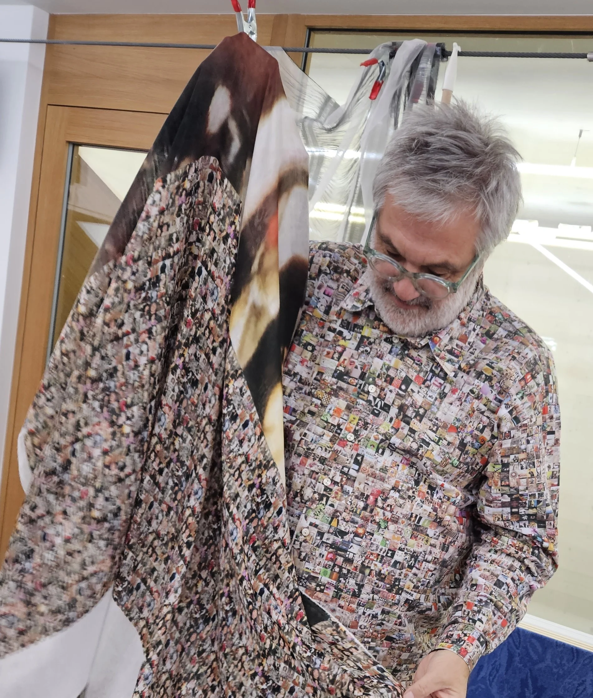 Aber auch die Schweizer Mode-Dame Christa de Carouge bezog ihre Stoffe hier bei Martin Leuthold. Eines Tages flatterte ihr eine Anfrage vom «Felsenfest» in Bivio auf den Tisch. Das ist eine Veranstaltung für Kunsthandwerk. «Da kam Christa zu uns und fragte, was soll ich da mit meinen schwarzen Kleidern?» Sie habe mal zugesagt und bekäme einen Ausstellungsplatz in einem Stall mit einem Heustock und wahnsinnig schöner Atmosphäre, berichtete sie Leuthold. Und sie habe sich nun überlegt, einen Kimono zu entwerfen, den sie über den Heustock hängen könne, erklärte sie. Aber nicht in Schwarz, sondern in bunten Alpenblumen. Und sie fragte, ob Martin Leuthold vielleicht für sie so einen Stoff entwerfen könnte …?