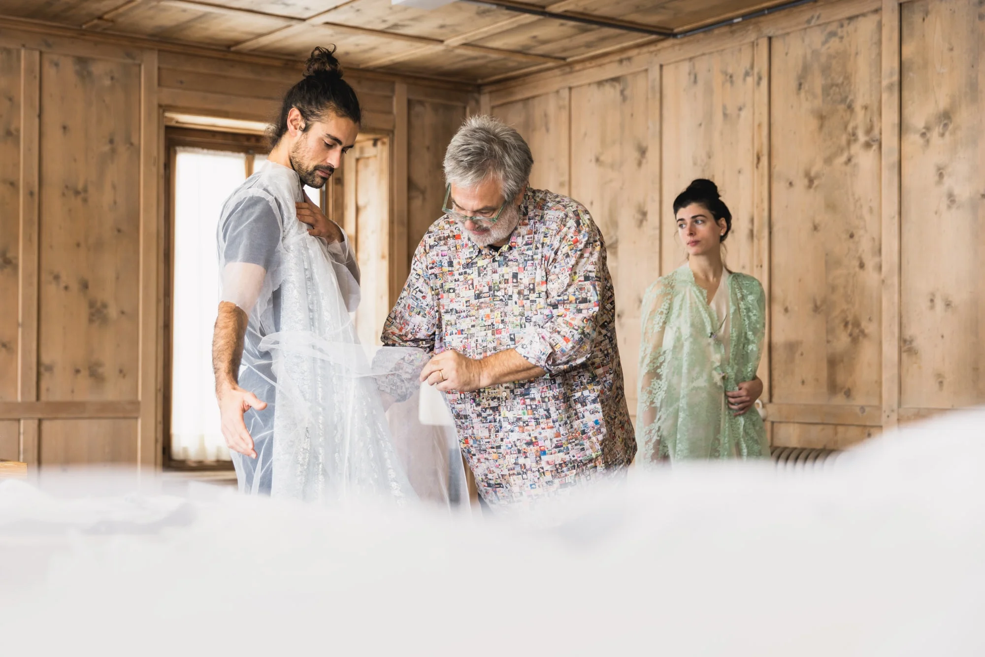 «Meine kreative Werkstatt ist hier in Hegi», sagt Martin Leuthold. «Aber die letzten zwei, drei Jahre war ich regelmässig jede Woche in Riom und Mulegns.» Rückblickend auf seine Tätigkeit bei Schläpfer und die edlen Roben auf den Laufstegen der Pariser Haute Couture, ist sein Engagement für die Aufführungen und die dazugehörigen Kostüme und Spielstätten von «Origen» ein Übergang, den er nicht für möglich gehalten hätte. «Wie die Frau Willi mit ihrem Hotel», sagt er. «Sie freut sich wahnsinnig, dass wieder etwas passiert mit dem Haus, das sie ein Leben lang gepflegt hat. Auch sie hätte diese Entwicklung wohl nicht für möglich gehalten.»
