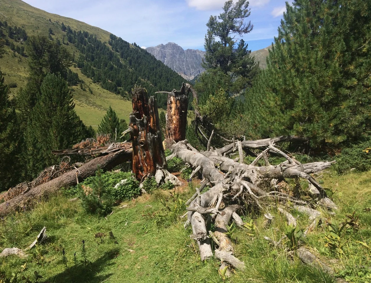 So gestärkt sind wir nun bereit für den von Leta Semadeni geschaffenen Himmel Tamangur, der nicht verschiedener sein könnte vom Weltenhimmel von Not Vital, nämlich still, lyrisch, unverkäuflich. Auf einem von Baumwurzeln durchsetzten Pfad wandern wir durch einen lichten Wald von Baumriesen, dazwischen junge Bäume und Baumskelette, zum Teil umgestürzt und zu bizarren Formen verwittert, ein Biotop, das viele Generationen von Bäumen vereinigt, welche der Gegenwart in aller Stille trotzen und gleichzeitig über eine Vergangenheit von Pflanzen, Tieren und Menschen zu wachen scheinen, welche in eine Zeit zurück geht, als hier noch Bären hausten und die Menschen auf ihrer Suche nach Wild und Bodenschätzen Teil der Natur, nicht deren alleinige Beherrscher waren.