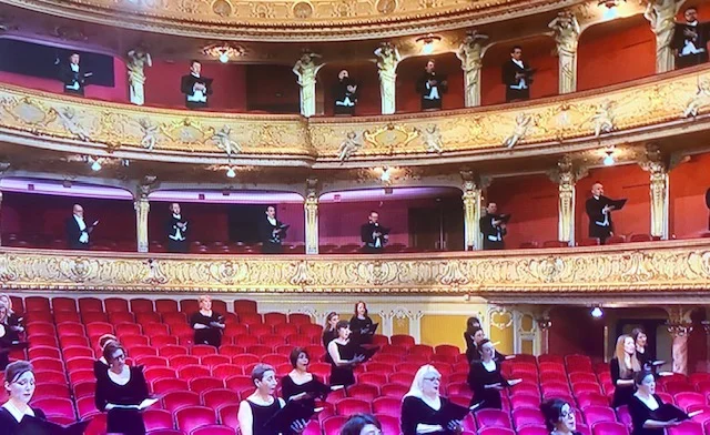 Das Bild, das uns mit Blick von der Bühne in den Zuschauerraum überrascht, ist fast surreal und man glaubt sich in einem Magritte-Gemälde gefangen: Im sonst leeren Parkett positionieren sich mit vorgeschriebenen Abständen die Frauen, in den oberen Rängen die Männer des Zürcher Opernchores und Mitglieder der Zürcher Sing-Akademie, oben einzeln auf die Logen verteilt.