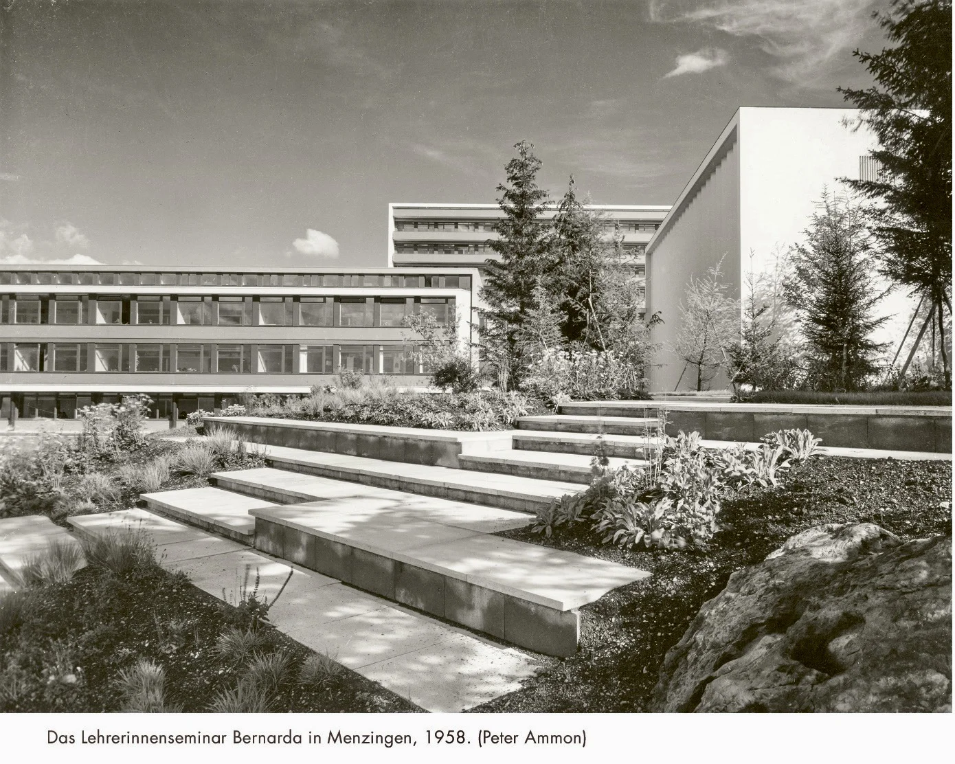 Schweizweit seinesgleichen sucht der monumentale Schulcampus auf der grünen Wiese in der Menzinger Moränenlandschaft. Es ist der Neubau des Lehrerinnenseminars Bernarda, der heutigen Kantonsschule Menzingen. Auftraggeberin war die franziskanische Schwesternkongregation vom Heiligen Kreuz in Menzingen. Entstanden ist in den Jahren 1956 bis 1958 ein Ensemble von fünf Baukörpern: das Schulgebäude, die Mensa, der Wohntrakt mit laubenartigen Balkonen, Aula und Kapelle, die Turnhalle. Jeder der fünf Bauten hat seine eigene Grösse und Gestalt; miteinander verbunden sind sie durch verglaste Verbindungsgänge. Sie bilden eine einheitliche, dramaturgisch komponierte Anlage. Mit seinem Ensemble realisiert Brütsch einen eindrücklichen pädagogischen Lern- und Lebensraum, und gleichzeitig weist sein architektonischer Ausdruck weit in die Zukunft. [4]