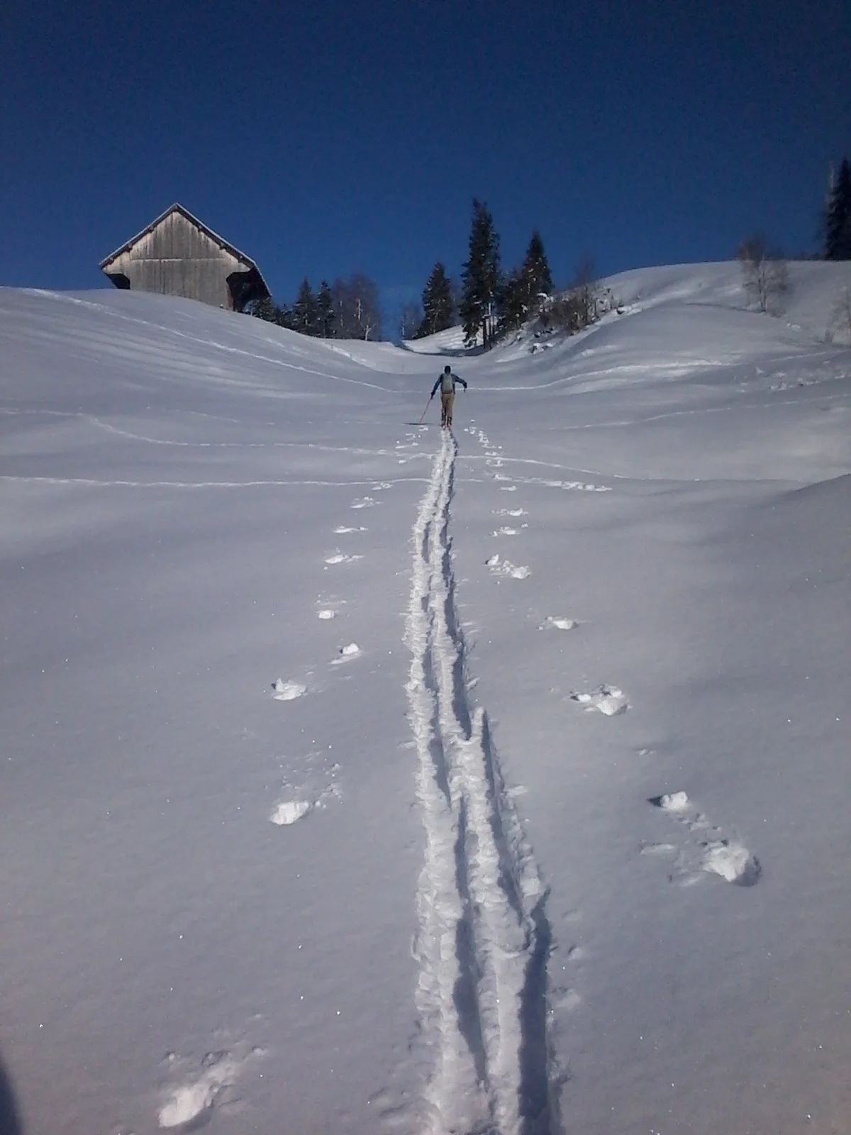 Man könnte sich vorstellen, dass die Germanenvölker Nordeuropas Götter hatten, die Ski fuhren. Und wenn diese heidnischen Schneegötter auf Wolken von Pulverschnee auf die Erde herunter kamen, tranken sie wohl ein Bier in einer Beiz wie dem Adlerhorst ob Oberiberg, und dann stiegen mit ihren Fellen wieder hinauf in den Schneehimmel. Singend und tanzend.