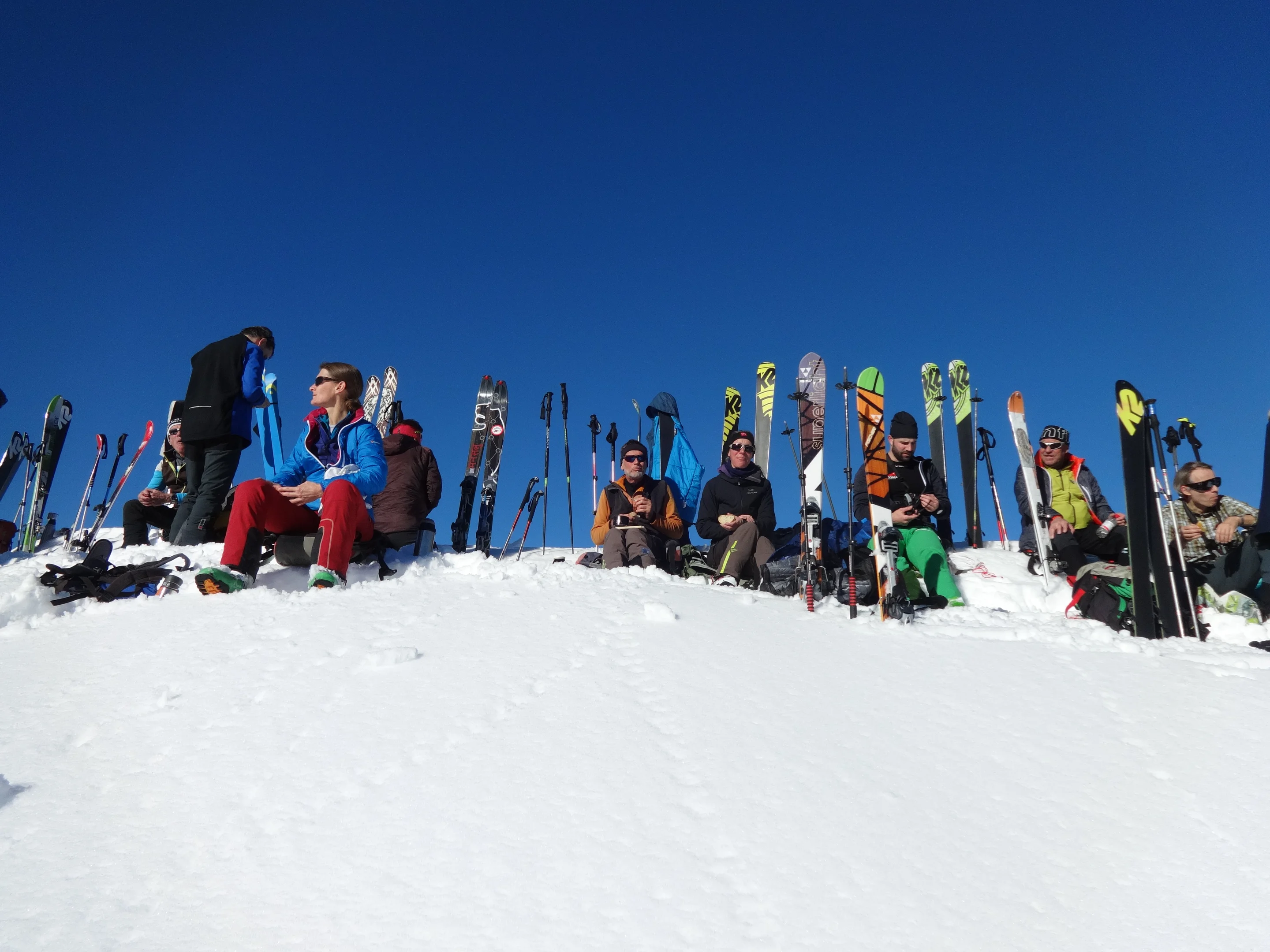 Anstrengend ist es an diesem wolkenlos sonnigen Wintermorgen aber kaum. Schon bald erreicht Christine mit der ersten Gruppe das letzte Steilstück zum felsigen Roggenstock, die zweite Gruppe, geführt vom Bergführer Franz Zürcher, folgt etwas später, und schliesslich hocken sie alle in der milden Wintersonne auf dem Schneegipfel: