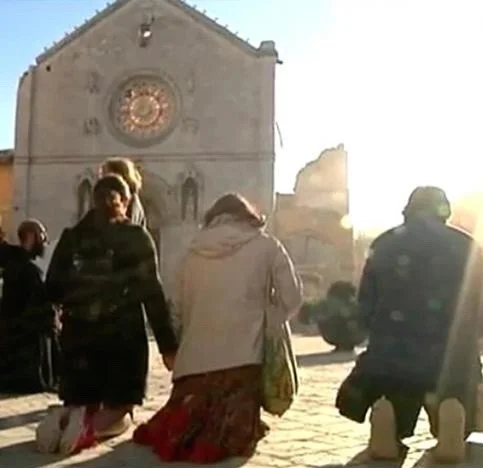 Vor der zerstörten Kathedrale in Norcia knieten am Sonntagvormittag Menschen nieder und beteten.