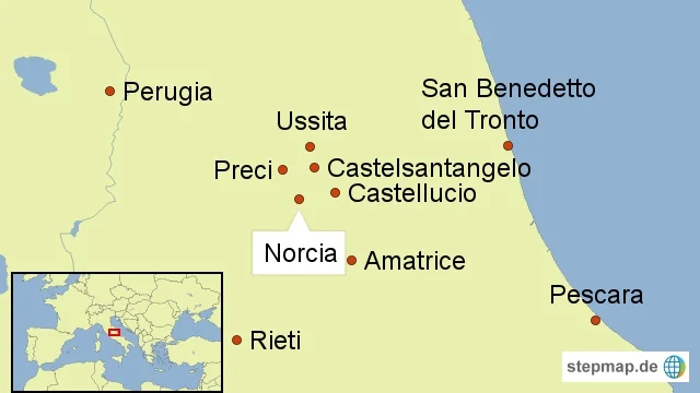 Norcia (deutsch: Nursia) ist die Heimatstadt des Heiligen Benedikt, des Gründers der Benediktiner. Bekannt ist ist neben Castellucio auch Norcia für seine Linsen-Produktion.