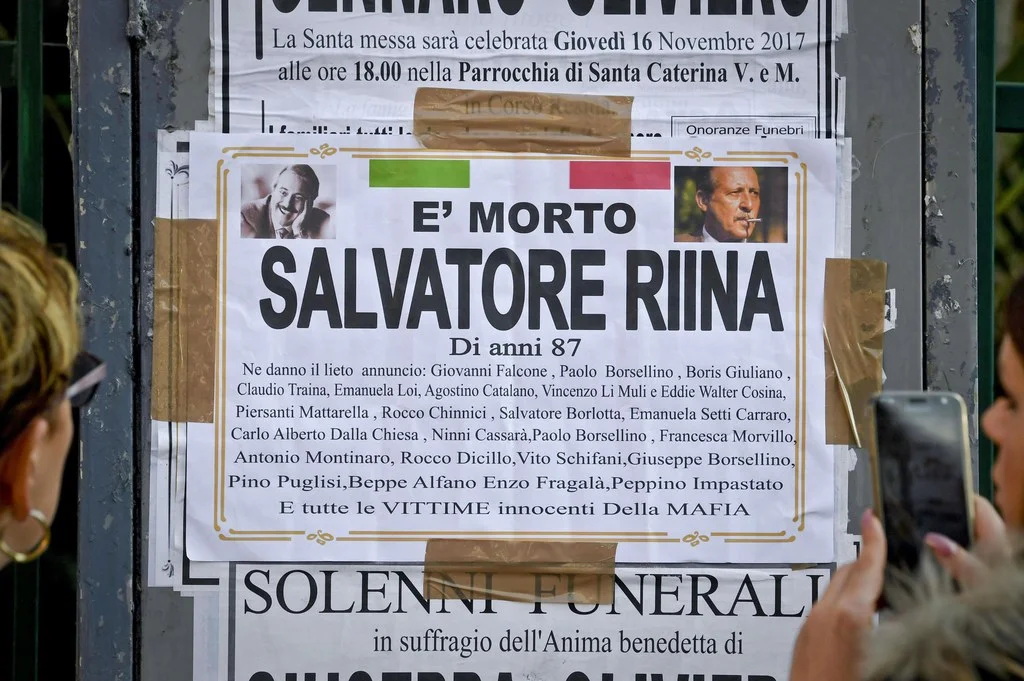 Links oben befindet sich das Bild des Mafia-Jägers Giovanni Falcone. Er war am 23. Mai 1992 bei einem Bombenanschlag in der Nähe von Palermo getötet worden. Rechts oben ein Porträt des Mafia-Jägers Paolo Borsellino. Er starb am 19. Juli 1992, als sein Auto in Palermo explodierte. Beide Bombenattentate waren von Totò Riina bestellt worden. Zu den „Unterzeichnern“ der „Todesanzeige“ gehören weitere namentlich aufgeführte Opfer des einstigen Chefs der sizilianischen Cosa Nostra. Die Anzeige klebt auf einer Plakatwand in Ercolano bei Neapel.