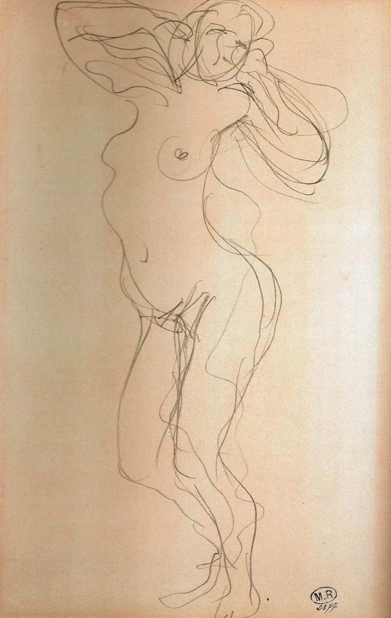 1907 stellt er in der Pariser Galerie Bernheim-jeune seine kambodschanischen Tänzerinnen aus. Rainer Maria Rilke war zu jener Zeit eine Art Privatsekretär Rodins und war begeistert von diesen „petites danceuses graciles“. Rodins Zeichnungen sind selten datiert. Oft sind sie auf Zetteln skizziert, die nicht mehr als 10 oder 15 Zentimeter messen. Gezeichnet sind sie mit Bleistift, schwarzer oder brauner Tinte, mit Kreide oder Farbstiften lavis gris. Einige sind dann mit Wasserfarben ausgemalt.