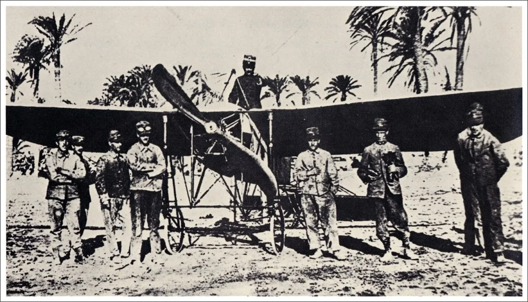 Am 1. November 1911 findet erstmals in der Geschichte ein Kampfeinsatz mit einem Flugzeug statt. Von einer Blériot-Maschine aus werden drei je zwei Kilogramm schwere Bomben auf türkische Verbände abgeworfen. Der Pilot überflog die feindlichen Stellungen und schleuderte die Bomben, die so gross wie Orangen waren, auf die osmanischen Soldaten ab.