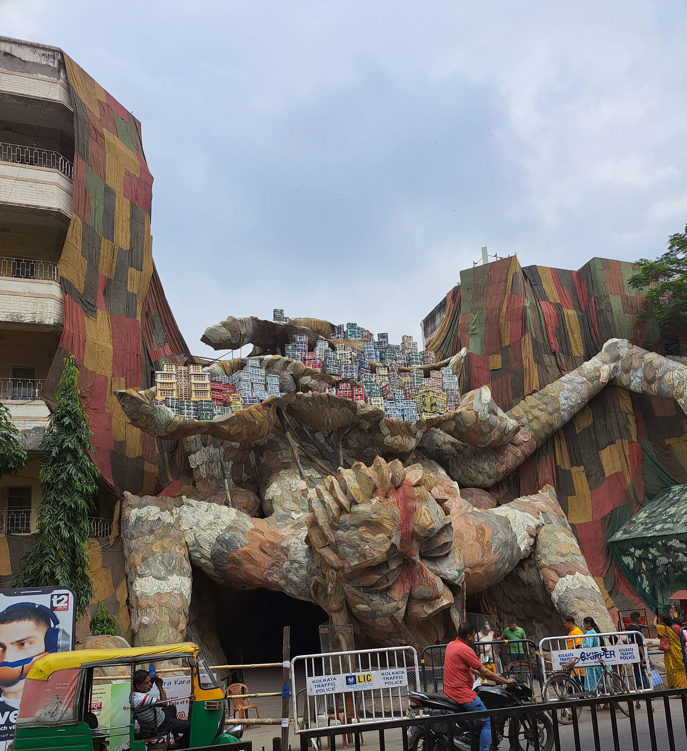 Es nahm Bezug auf den Bürgerkrieg im Bundesstaat Manipur östlich von Bengalen, in dem sich seit einem halben Jahr lokale Stammesgesellschaften förmlich zerfleischen. Der ethnische Säuberungskrieg hat eine Fluchtbewegung bis nach Kolkata ausgelöst. Hier, so die Botschaft, soll die Göttin eingreifen, denn sie allein kann das Böse auf der Welt bezwingen.