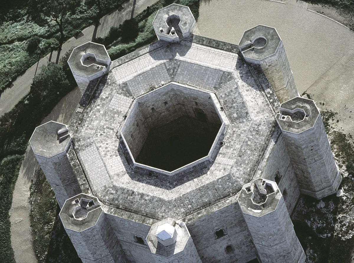 Der streng geometrische und symmetrische Baukörper der Hohenstaufenburg in Süditalien wirkt kristallen. Die Burg ist ein Achteck um einen offenen Innenhof mit einem wiederum achteckigen, stumpfen Turm vor jeder Ecke. Sie enthält auf zwei Geschossen je acht Säle von trapezfömigem Grundriss. Der karge Bauschmuck aussen und innen zitiert die burgundische Frühgotik der Zisterzienser und die klassische Antike; haustechnische Anlagen – Wasserversorgung und -entsorgung, Toiletten, Belüftung, Sicht-, Hör- und Sprechverbindungen – knüpfen an orientalische, arabische Lösungen an. Kein Wunder.... Der Bauherr, ein Enkel Barbarossas, der Staufer Friedrich II. (1194-1250), wuchs als König beider Sizilien in Palermo auf, damals Europas grösster Stadt, ein Schmelztiegel byzantinischer, normannischer und arabischer Kultur. Wenige Urkunden erhellen die Baugeschichte der Burg. Begonnen um 1240, war der Bau beim Tod Friedrichs gerade fertig geworden – oder wurde umständehalber eingestellt. Vielleicht waren ursprünglich drei Stockwerke geplant.