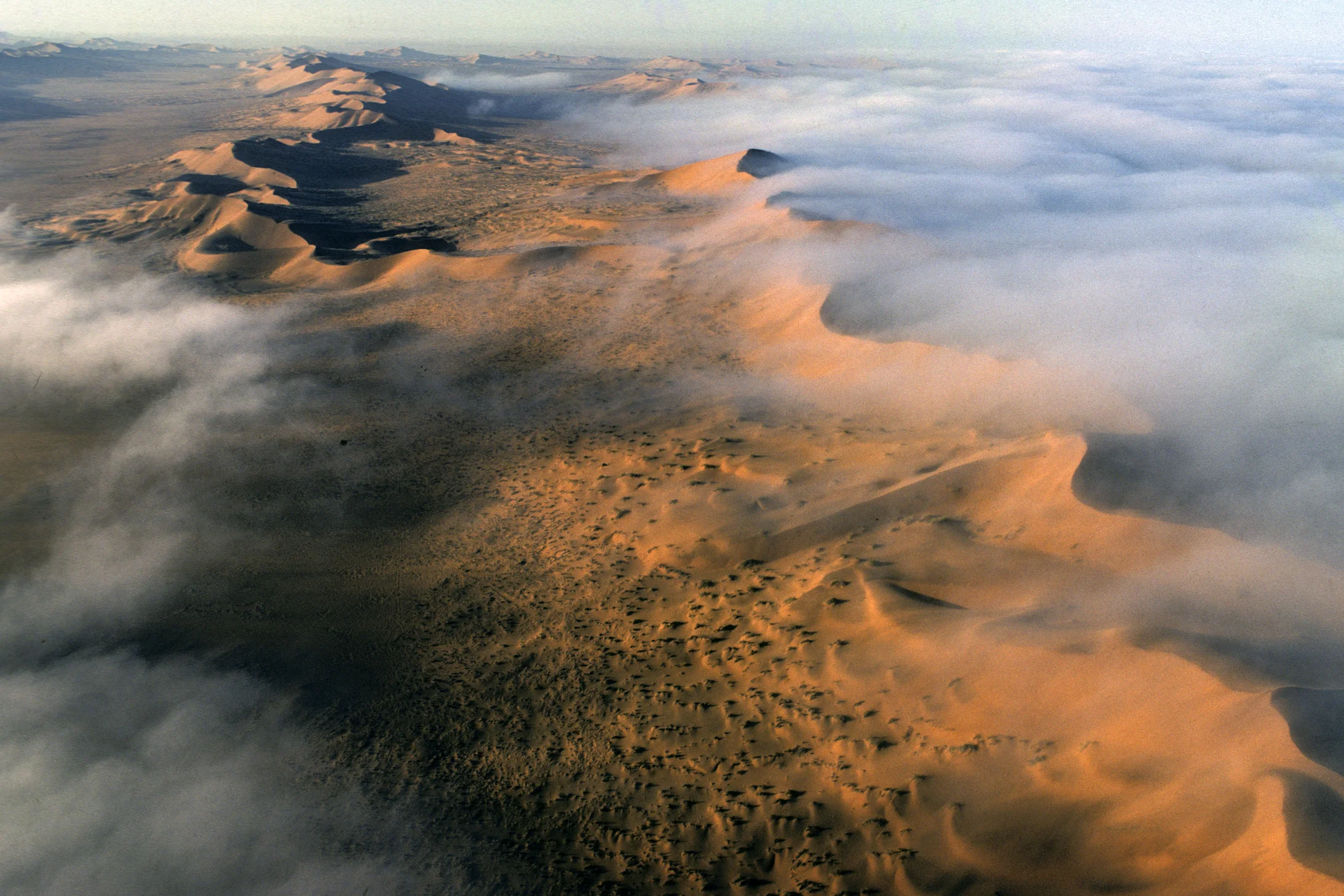 Etwa alle zehn Tage des Monats vernebelt der Morgenwind die Wüste bis zu 80 Kilometer landeinwärts. Nebel stillt den Durst der Pflanzen, zum Teil umweglos. Die Welwitschia scheint befähigt, die Nebeltröpfchen auf ihren Blättern direkt zu verwerten. Von dem Morgennebel profitieren auch Käfer, Skorpione, Spinnen, ja sogar Eidechsen. Furore als Nebelschlucker machen zwei Schwarzkäfer der Gattung Onymacris aus der Familie der Tenebrionidae. An kalten Nebelmorgen erklettern sie den Kamm einer Sanddüne, drehen sich dort in den Wind, machen eine Art Kopfstand und trinken die von ihrem Rücken zum Mund rollenden Nebeltropfen. Diese Nebeltrinker sind die Stars der Namib.– Jahr des Flugbilds: 1980. (Copyright: Georg Gerster/Keystone)
